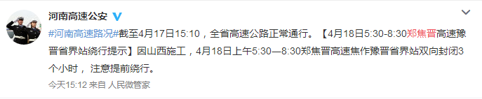 因山西施工,4月18日上午5:30―8:30郑焦晋高速焦作豫晋省界站双向封闭3个小时, 注意提前绕行。