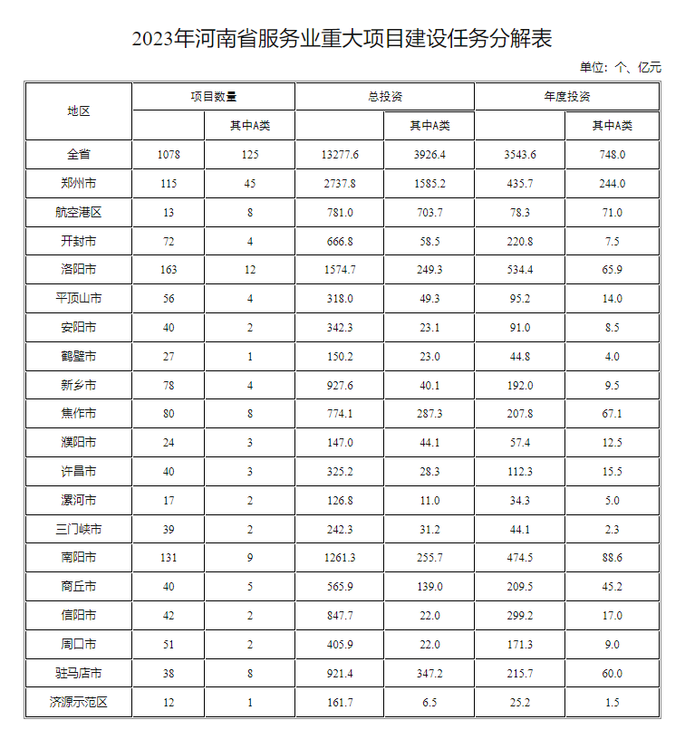 (三)扩大有效投资行动。 清单化管理推进重大项目,确定125个投资大、业态新的省级项目(A类)和1000个左右市级项目纳入服务业年度项目清单,强化省市工作协同联动,分类调度督导,力争全年完成投资3500亿元以上。积极扩大民间投资,全力推进服务业领域招商引资,争取中国物流、万达、京东等企业在豫落地一批项目,加快郑州航空港区大型滨水城市服务中心、洛阳大河荟等标志性项目进度。扎实谋划储备专项债、中长期贷款等服务业项目,抢抓政策机遇争取国家支持。(省发展改革委、商务厅、财政厅、人行郑州中心支行、河南银保监局按职责分别负责)