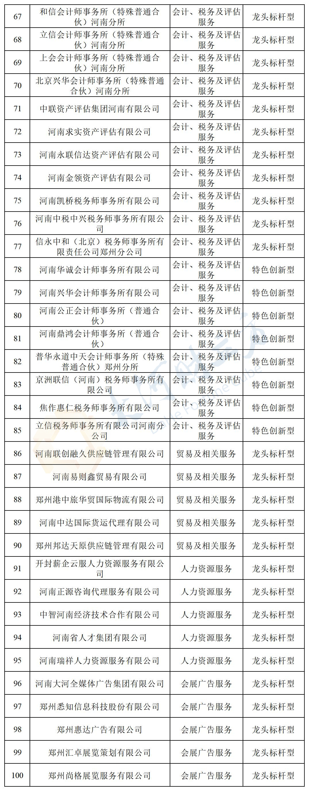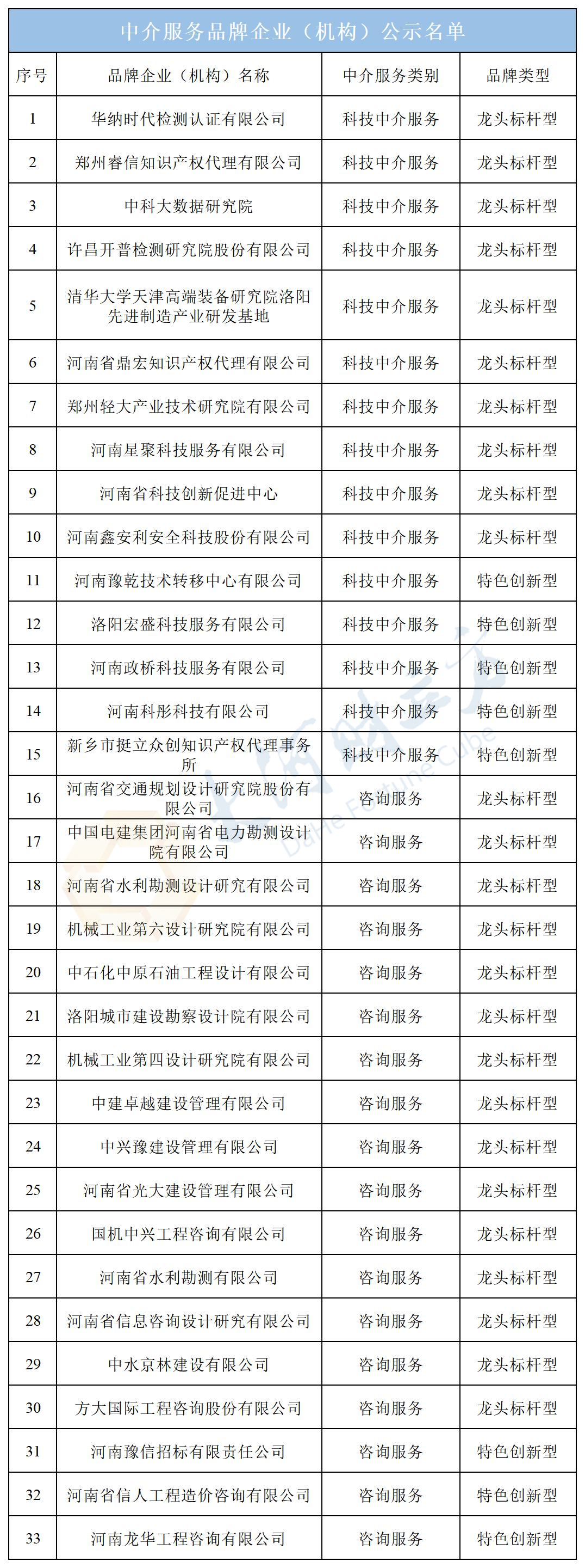 品牌类型包含龙头标杆型、特色创新型。其中,许昌开普检测研究院股份有限公司、河南省交通规划设计研究院股份有限公司、河南资产管理有限公司、中原再担保集团股份有限公司等入选龙头标杆型;洛阳宏盛科技服务有限公司、河南航投通用航空投资有限公司等入选特色创新型。