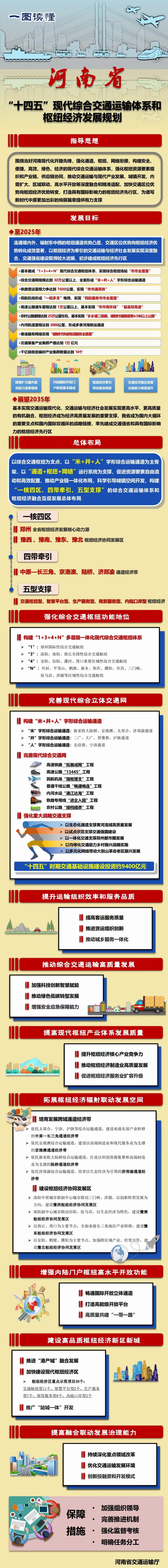 《规划》提出构建由郑州国际性综合交通枢纽,洛阳、南阳、商丘全国性综合交通枢纽,安阳、信阳、周口、漯河重要区域性综合交通枢纽组成的“1+3+4+N”多层级一体化综合交通枢纽体系,加强航空、铁路、内河水运主导型综合交通枢纽站场和物流枢纽建设。