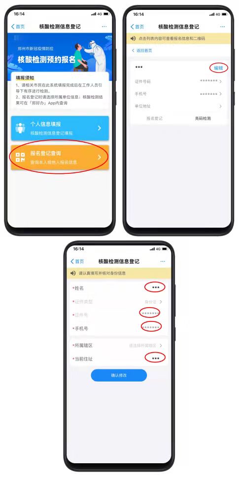 针对以上情况,郑好办人士告诉大河报·大河财立方记者,出现这种情况可以通过郑好办APP修改,从郑好办首页的“疫情服务”按钮或“疫情服务专区”找到“核酸检测信息登记”,点击“报名登记查询”,点击右上角“编辑”按钮,即可修改已登记的信息,除身份证信息外均可修改。