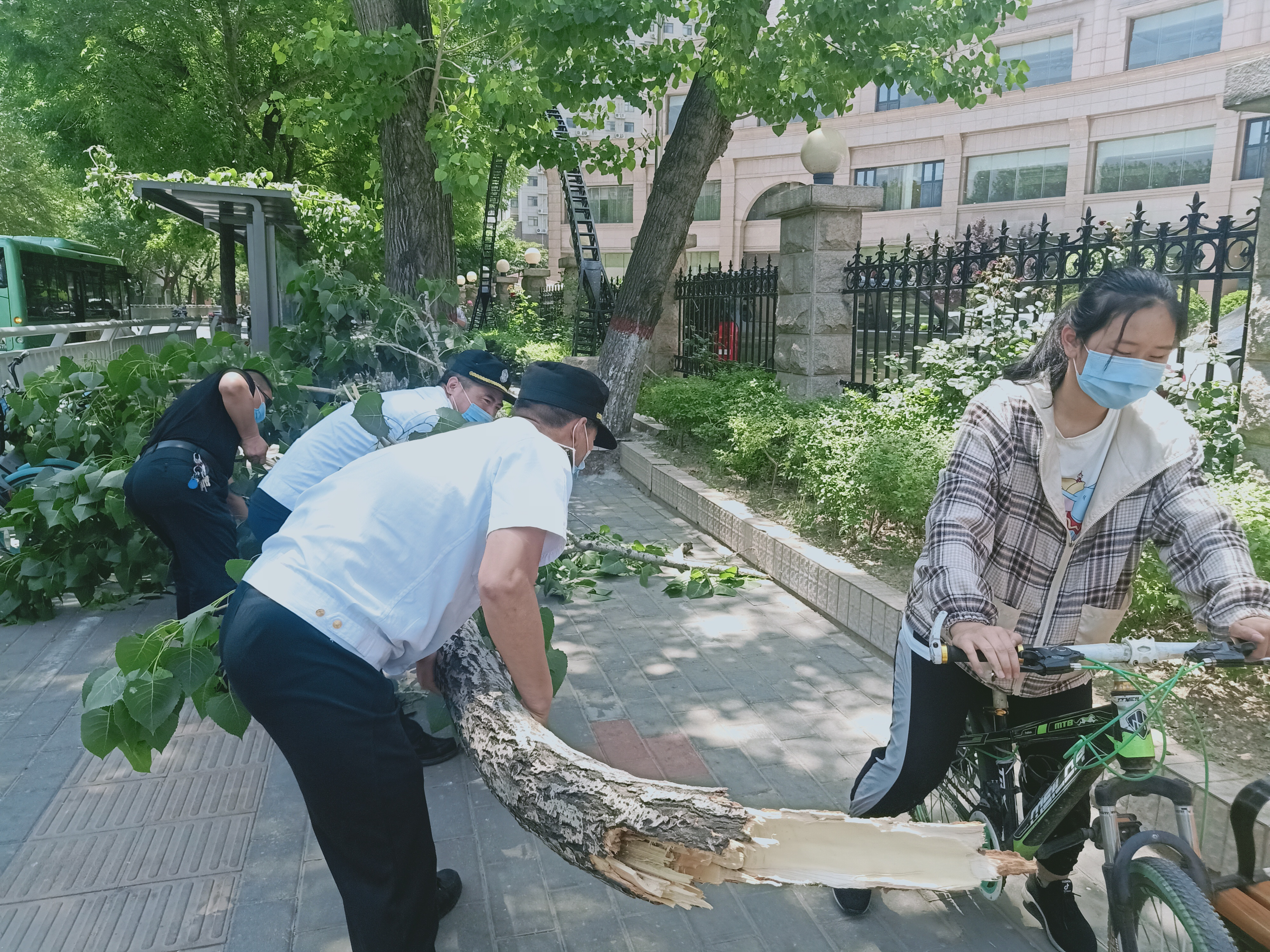 为避免意外发生,常遂民和常志勇立即上前疏散行人,把树枝从公交站牌上拉下来后,搬到路边的空地上。经过现场查看,他们发现树上还有一根大树枝断裂摇摇欲坠,立即拨打了郑州城建热线,工作人员表示尽快通知绿化部门去现场处置,消除安全隐患。
