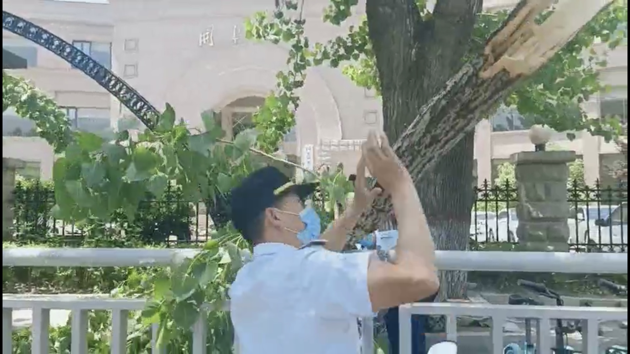空中突然掉下一根比腿粗的大树枝,吓得行人惊叫四散