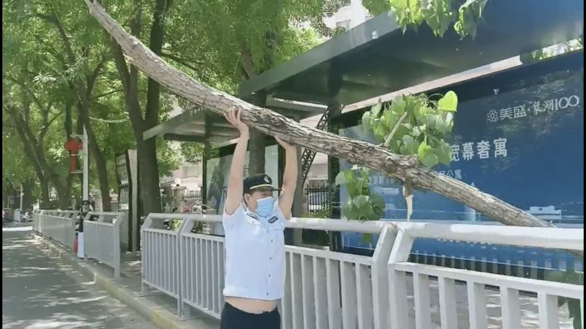 5月19日中午12时许,金水区丰产路办事处巡防队员常遂民、常志勇,巡逻到辖区东明路与丰产路交叉口南约100米处,突然听到路西传来惊叫声。二人扭头一看,发现路西侧的一棵大杨树上,突然有一根粗大的树枝断裂掉落,正砸道公交站牌的顶部,吓得在站牌前候车的乘客和几名过路的行人慌忙躲闪。幸运的是,粗树枝落下时,被2米多高的公交站牌和人行道护栏撑起,并没有砸住人。