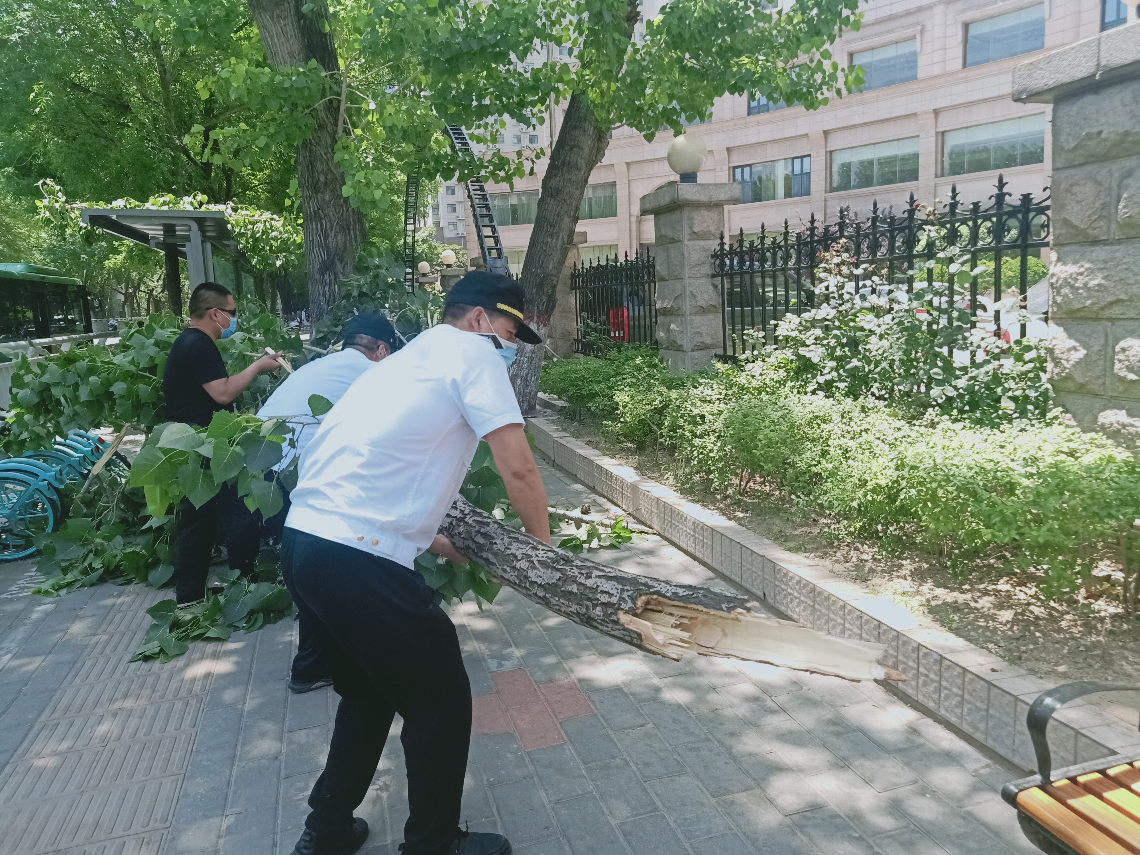 为避免意外发生,常遂民和常志勇立即上前疏散行人,把树枝从公交站牌上拉下来后,搬到路边的空地上。经过现场查看,他们发现树上还有一根大树枝断裂摇摇欲坠,立即拨打了郑州城建热线,工作人员表示尽快通知绿化部门去现场处置,消除安全隐患。
