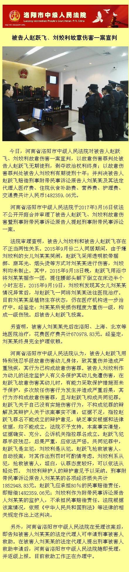 【被告人赵跃飞、刘姣利故意伤害一案宣判】今日,河南省洛阳市中级人民法院对被告人赵跃飞、刘姣利故意伤害一案宣判,以故意伤害罪判处被告人赵跃飞无期徒刑,剥夺政治权利终身;以故意伤害罪判处被告人刘姣利有期徒刑十年;并判决被告人赵跃飞赔偿刑事附带民事诉讼原告人刘某某及其法定代理人医疗费、住院伙食补助费、营养费、护理费、交通费共计人民币1482359.06元。