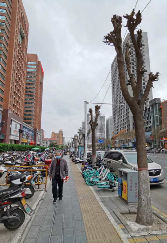 记者注意到,很多树木枝干被砍处颜色发白,有市民表示,刚砍不久。在经三路东侧,同样大小的行道树没有被修剪,高约3层楼左右,已经长出嫩绿的枝叶。