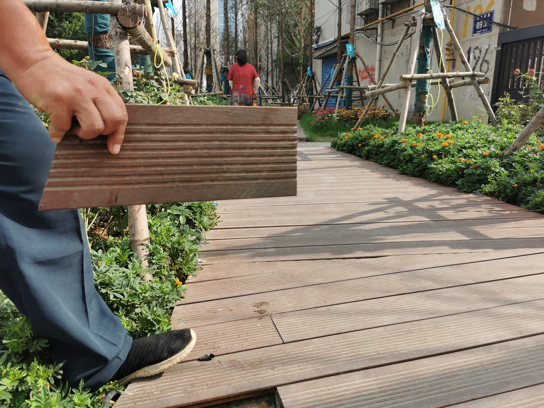 和水杉不同的是,这些花卉植物个头较小,整体生长旺盛。绿化花卉中间,设置了一条宽约1.5米的木质栈道,它们呈南北向蜿蜒铺设。