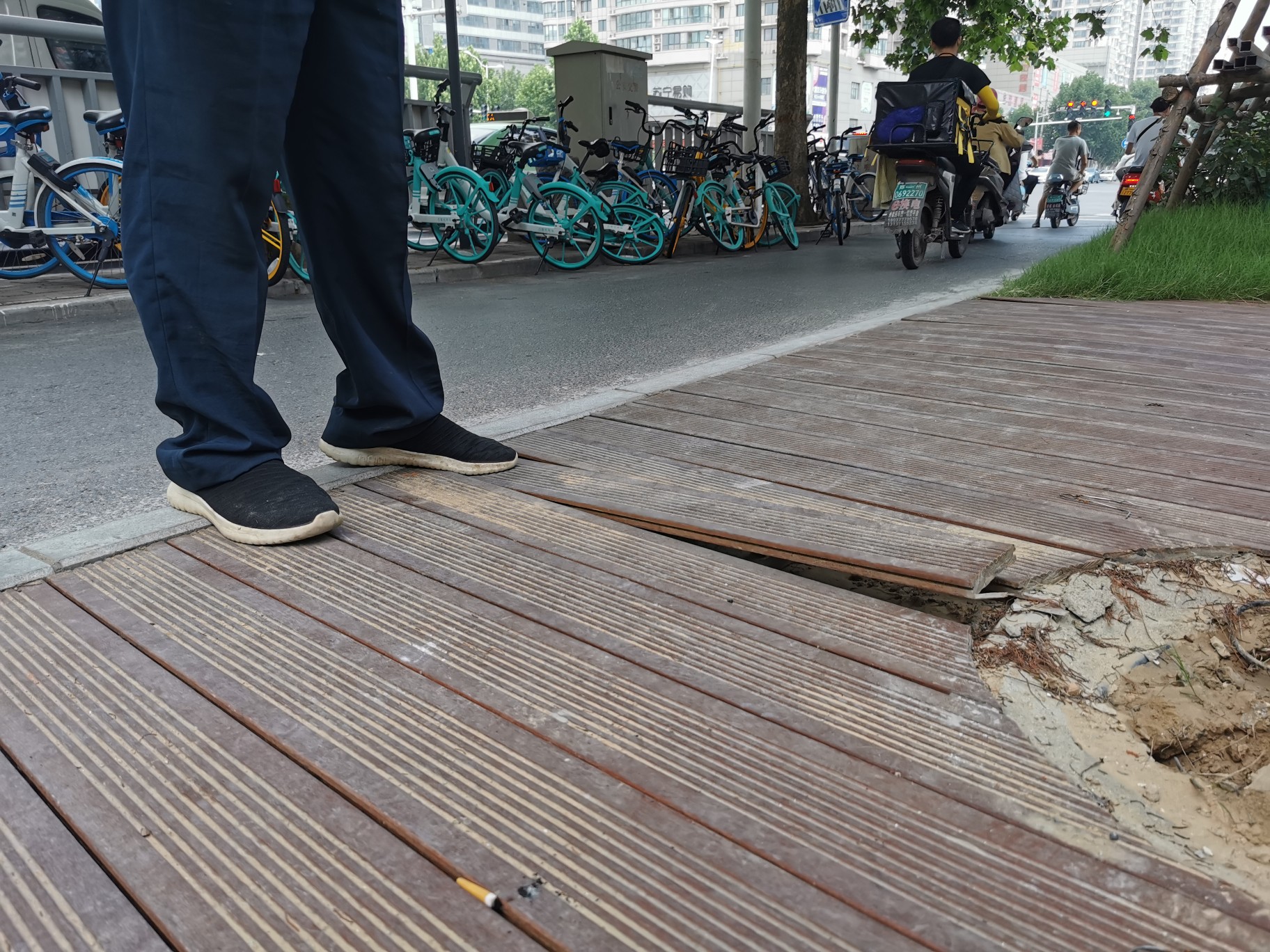 行走木质栈道上,多处发出“啪啪”响声,“没有粘连牢固,不少木板已经翘起,老年人、儿童走上面,很容易绊倒。”