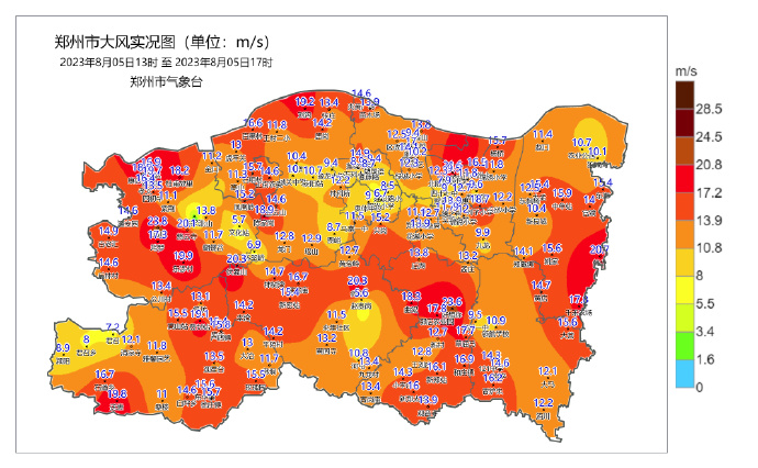 大风:2023年08月05日13时至17时,郑州市出现大风天气,平均风力5-6级,阵风8-9级。全市有71个自动站极大风速达到7级以上。极大风速出现在巩义市的山川站23.8米/秒(9级)。
