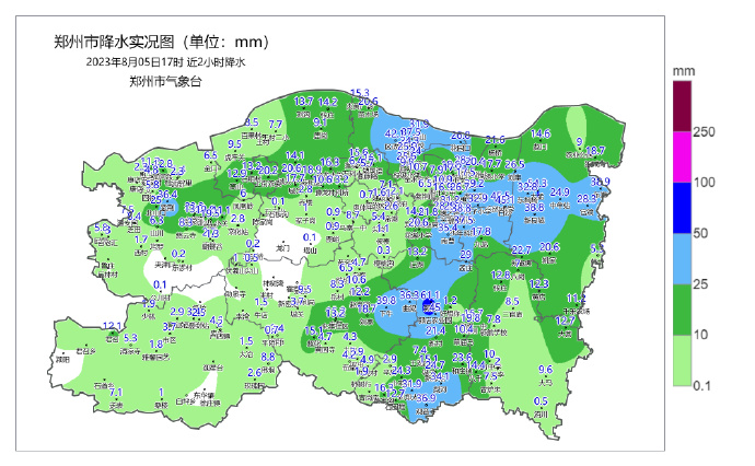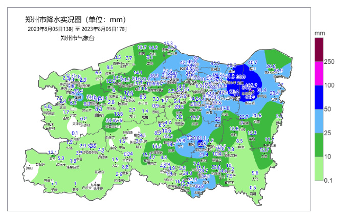 过程降水量:2023年08月05日13时至2023年08月05日17时,郑州市出现阵雨、雷阵雨,局部暴雨、大暴雨。最大降水出现在中牟县的大孟105.7毫米。最大小时雨强63.0毫米(出现在中牟县的刘集站05日14时至05日15时)。