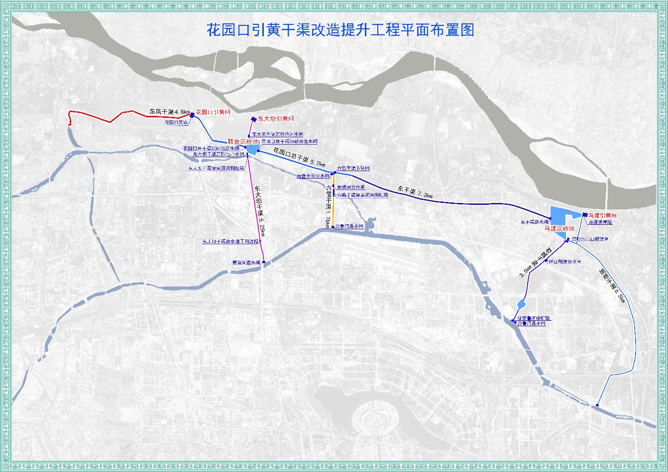 “这部分生态水系的水源,从邙山提灌站出发,途径石佛沉沙池,抵达西流湖,再通过暗管抵达各条河道的供水口门。”郑州市水利局河道工程管理处相关人士说,不过,由于当时郑州市区的饮用水源还是黄河水,所以生态用水很多时候是需要给生活用水让路的。这种状况一直持续到2014年年底。随着南水北调中线工程的通水,让郑州市区由“吃”黄河水改为了“吃”丹江水,黄河水调整为生态用水。而郑州市区每年所利用的黄河生态用水由2010年的6000万立方米,逐渐增加到了目前的3亿立方米,水域靓城才有了基础。黄河流域生态保护和高质量发展上升为国家战略,郑州市最新城市功能定位又要求北部“静”下来,花园口灌区也迎来了新的历史机遇。目前,花园口引黄干渠开发利用方案正在细化和完善之中,花园口引黄干渠改造提升工程将以引黄水开发利用为核心,以水系连通和引黄补源为主线,以两岸绿化景观建设为串联,打造“集引黄补源、生态修复、文化传承、休闲娱乐多重功能于一体的生态景观带”。项目区范围北起黄河南岸,西到东风渠,南至贾鲁河,东至东四环,涉及惠济、金水和郑东新区,覆盖面积70平方公里。项目区设计以总干渠、东干渠为横轴,以东风干渠、东大坝干渠、六堡干渠、祭城干渠、姚桥干渠为纵轴,联通区域内黄河、贾鲁河、索须河、金洼干渠、石沟、金京明渠、金京湿地、任庄明渠、西干渠支渠、任庄湿地、化蝶湖等,在郑州北部区域构成外部连通、内部循环的现代水体网络。
