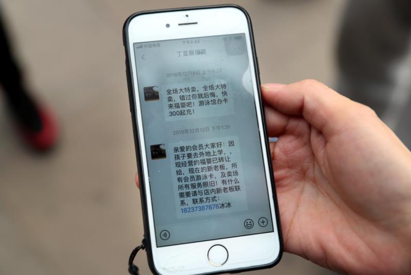 现场一名孩子家长给记者提供的丁某某发给会员一条信息显示,因孩子去外地上学,现经营的福婴已转让给现在老板,所在会员游泳卡,及卖场所有服务照旧,如需要可与新老板联系,后面留有联系方式。