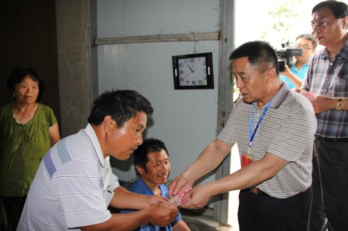 图为永城市人大常委会副主任王家文为贫困残疾人送去慰问金
