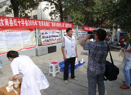 12日上午,在汝南县天中大道南段 “世界急救日”主题宣传活动现场,“汝南县红十字会2015年世界急救日‘急救与老龄化人群’主题宣传活动”的横幅格外醒目,铁栅栏上挂满了宣传横幅和展板。县第二人民医院和县中医院的12 名红十字志愿者正忙着为老年人免费体检身体。量血压、健康咨询、老年人常见疾病的预防和突发急病的现场救护讲解,以及发放活动宣传彩页、救护用品(三角巾和弹力绷带);征求群众对活动开展的意见和建议,抽样填写调查问卷。