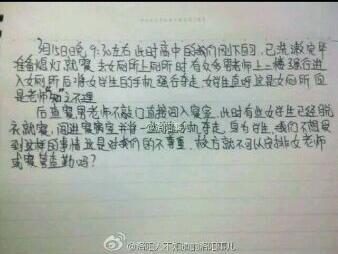 记者注意到,发帖网友配有一张图片,其中一张纸上写明了情况:3月15日晚9:30左右,高中的我们刚下自习,已洗漱完毕准备熄灯就寝,上厕所时有众多男老师强行进入女厕所,后将女学生的手机夺走,女学生直呼这是女厕所,但老师置之不理。
