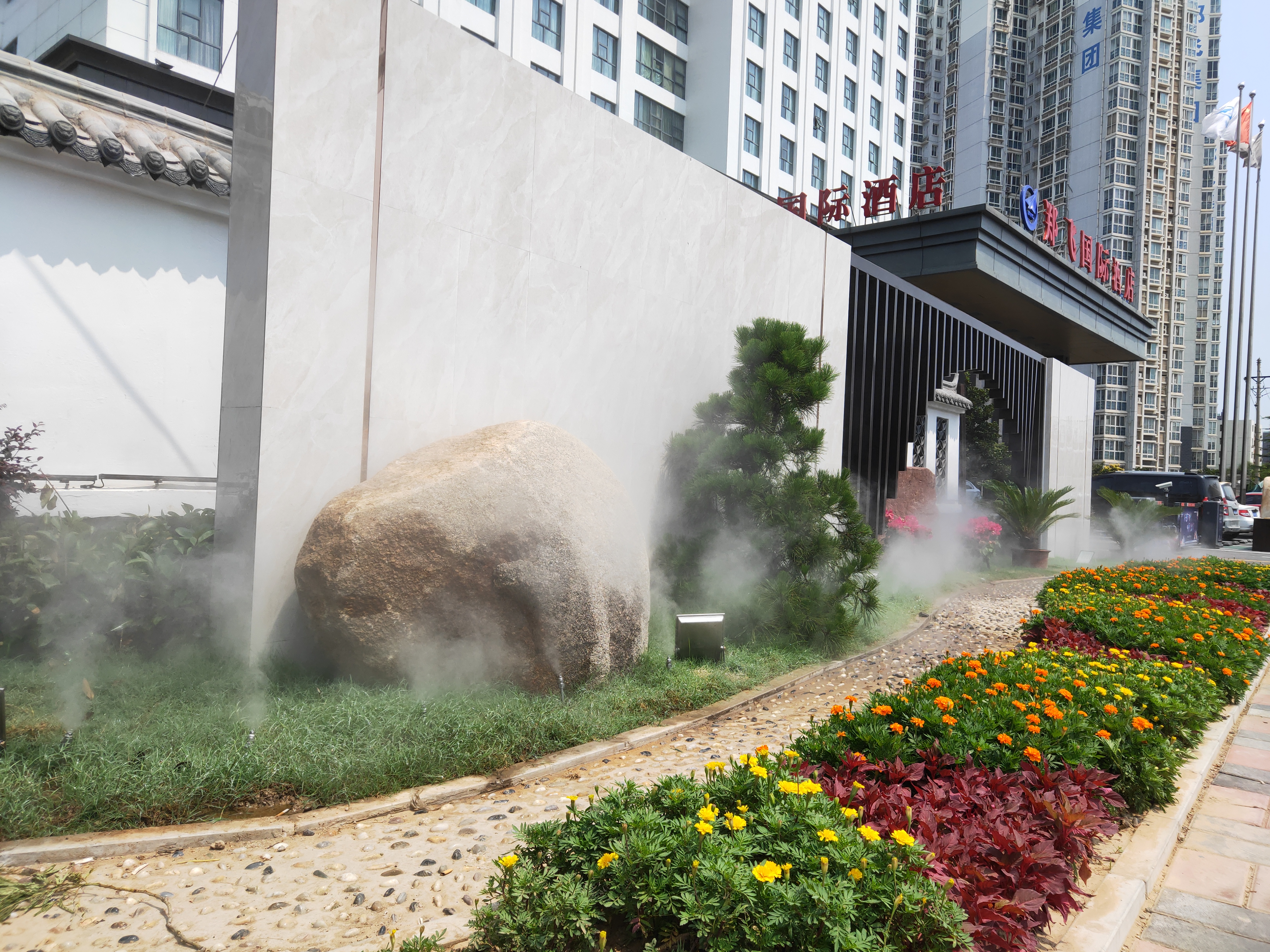 8月30日上午,郑州南三环与淮南街交叉口附近的郑飞酒店两侧,白墙绿瓦、窗棂隽秀,景观带中繁花似锦、松竹交映。