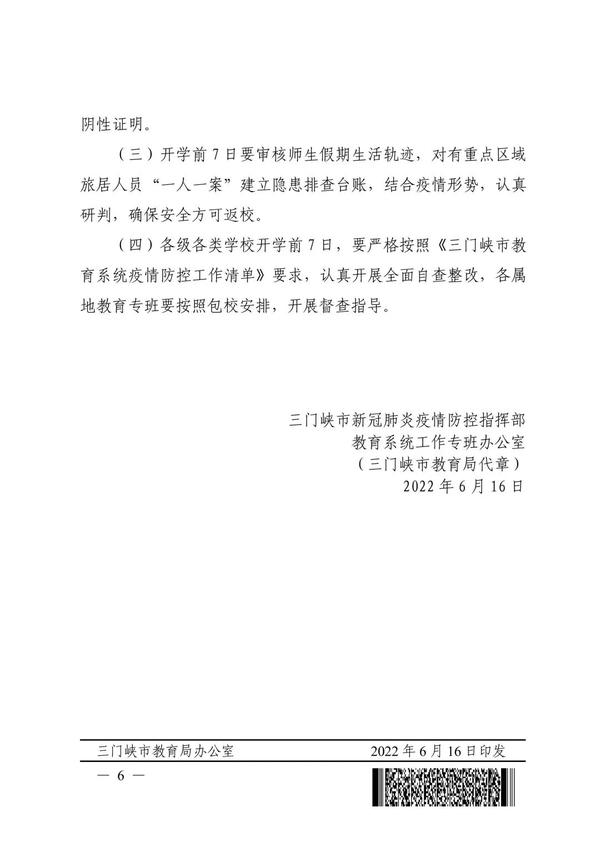 师生出三门峡市辖区,要继续按照《三门峡市教育系统疫情防控工作清单》要求,履行报、批流程,返回时,要提前三天落实学校、单位双报备,根据疫情形势,按照社区要求,落实相应的防疫措施。