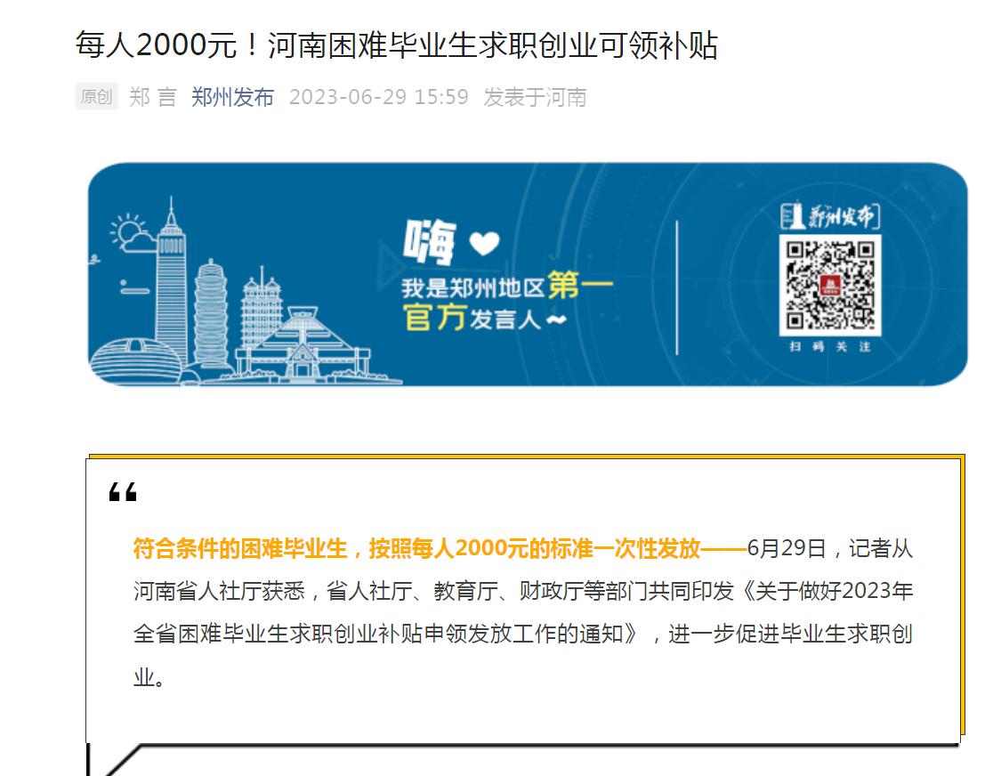 符合条件的困难毕业生,按照每人2000元的标准一次性发放——6月29日,记者从河南省人社厅获悉,省人社厅、教育厅、财政厅等部门共同印发《关于做好2023年全省困难毕业生求职创业补贴申领发放工作的通知》,进一步促进毕业生求职创业。