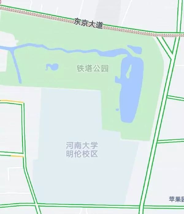 搜索百度地图可以看到,开封铁塔公园的南门正对着河大明伦校区(老校区),仅仅一墙之隔,而东边的铁塔湖往南突出的部分更是和河大融为了一体。