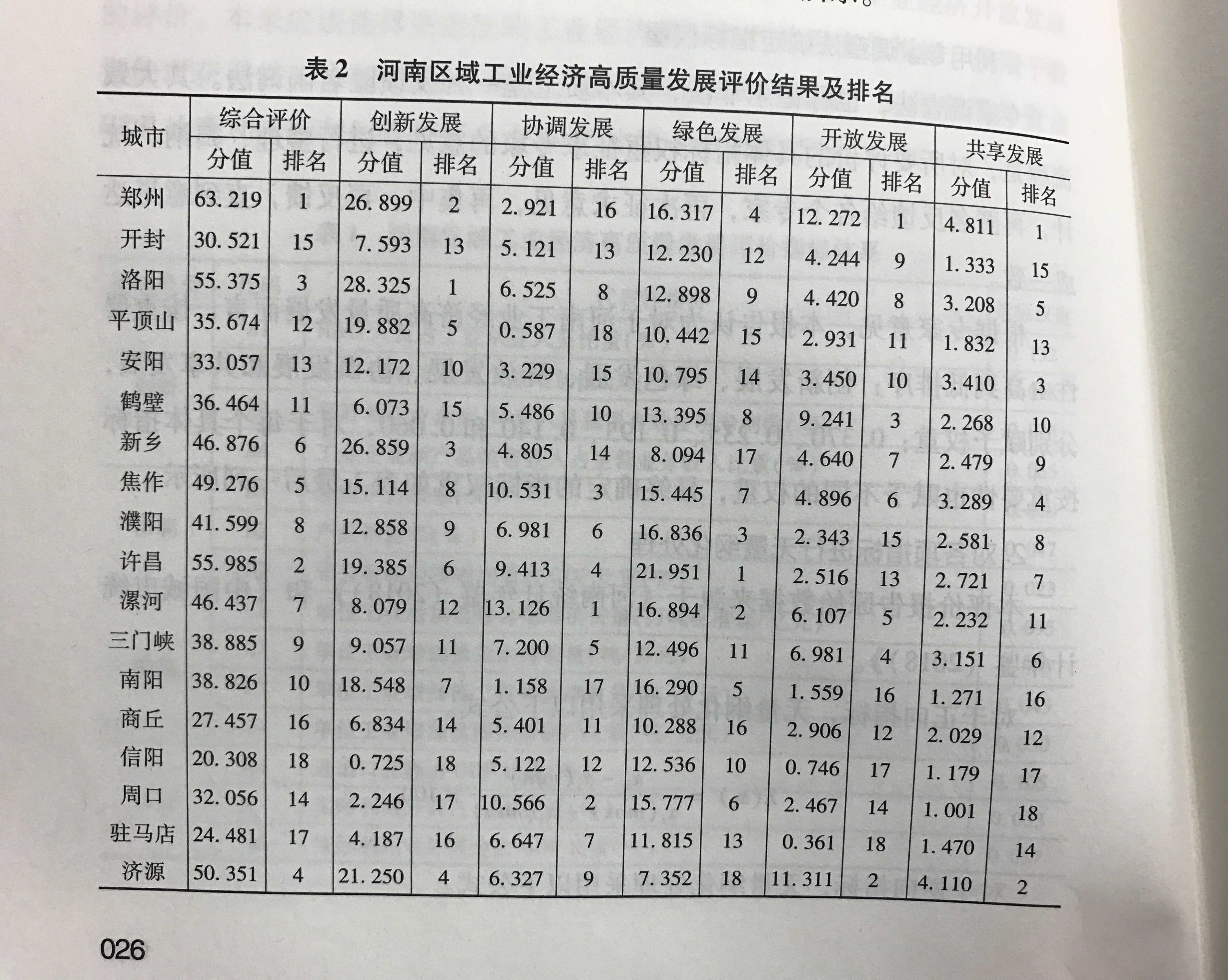 调查评价篇——《河南区域工业经济高质量发展评价报告》,围绕创新、协调、绿色、开放和共享等角度构建区域工业经济高质量发展评价指标体系,对河南18个市工业发展质量进行综合评价,结果显示,郑州、许昌、洛阳、济源和焦作,位列河南区域工业经济高质量发展综合排名前五位。从创新发展看,洛阳、郑州、新乡、济源和平顶山位居前五;从协调发展看,漯河、周口、焦作、许昌和三门峡位居前五;从绿色发展看,许昌、漯河、濮阳、郑州和南阳位居前五;从开放发展看,郑州、济源、鹤壁、三门峡和漯河位居前五;从共享发展看,郑州、济源、安阳、焦作和洛阳位居前五。