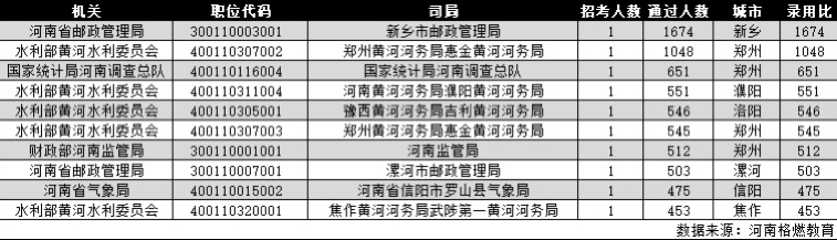 2020年国考河南地区千里挑一岗位诞生,河南省邮政管理局下属新乡市邮政管理局与水利部黄河水利委员会下属郑州黄河河务局惠金黄河河务局分别以1674:1与1048:1的报名录用比夺取,今年报名录用比前十的最低入选门槛为453:1。