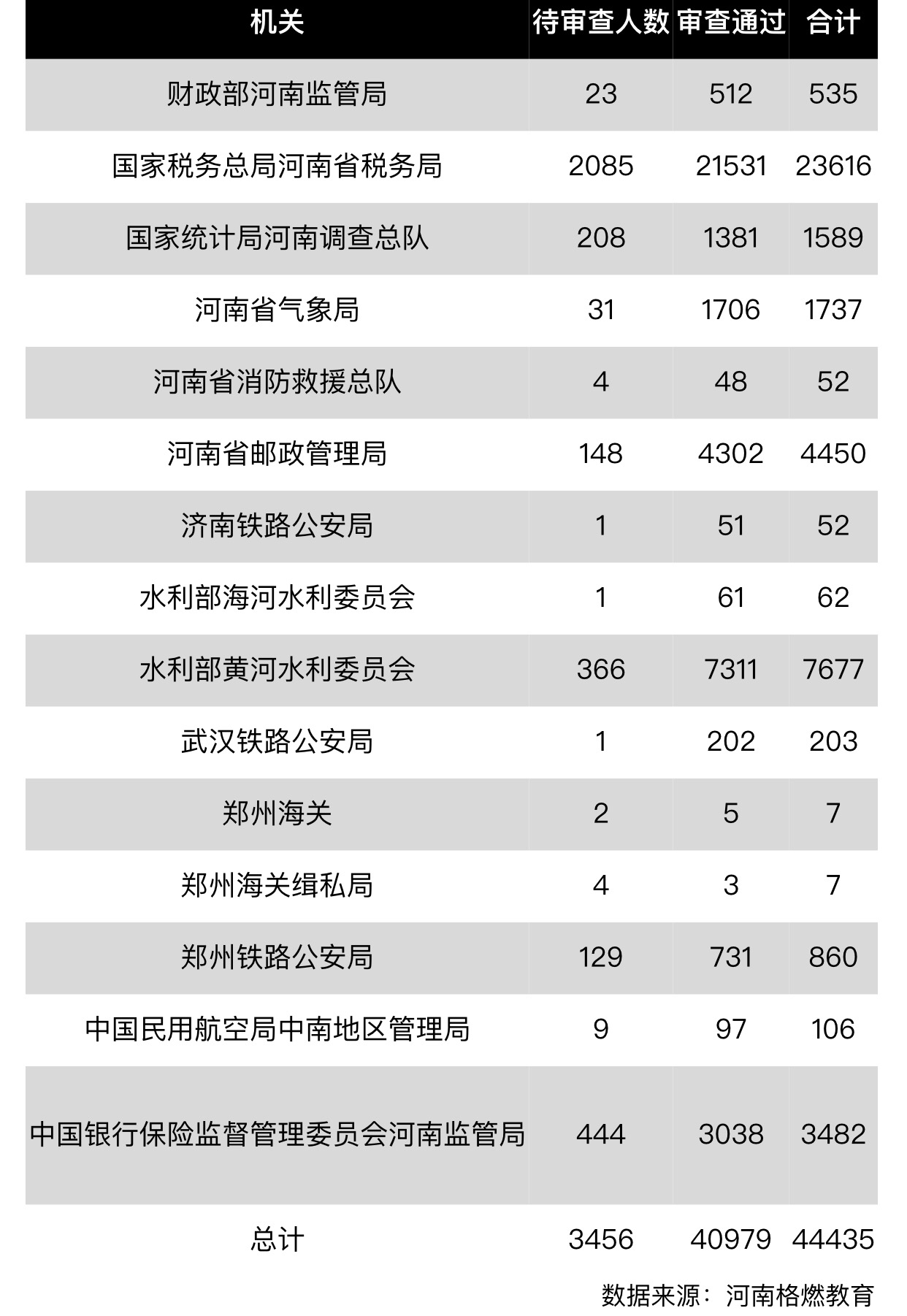 10月24日,2020年国家公务员报名进入最后一天,截止24日15:30,来自河南格燃教育的数据显示,国考河南地区共审核通过人数达到40979人,待审核人数3456人,合计44435人,河南格燃教育报名指导专家吕江涛预计河南总报名人数将会突破4.5万人。