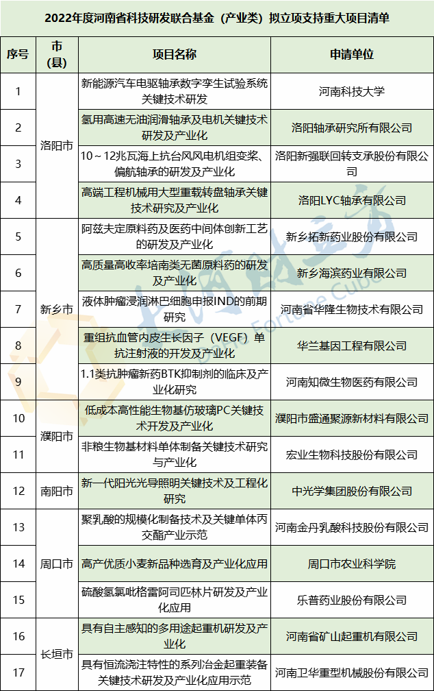 名单显示,由河南科技大学主持的新能源汽车电驱轴承数字孪生试验系统关键技术研发等17个项目入选。其中,新强联、拓新药业、中光学、金丹科技等多家上市公司主持的项目入选。