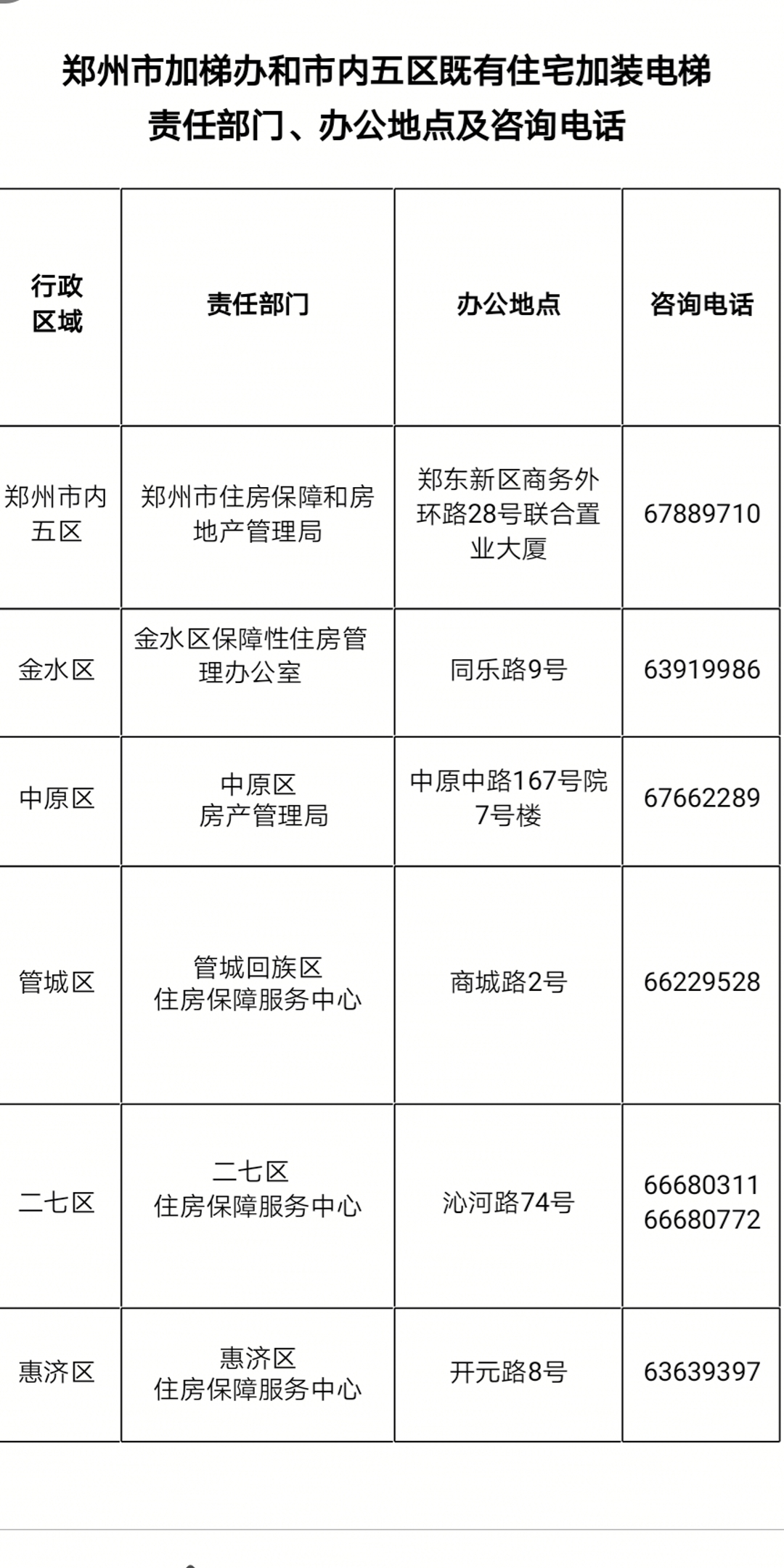 11月20日、21日,大河报·大河客户端独家再关注郑州老楼装电梯这一重大民生工程后,郑州市住房保障和房地产管理局负责老楼装电梯工作的该局房屋安全处相关负责人,通过大河报•大河客户端独家首次发布郑州市加梯办及市内五区加梯办公地点及咨询电话,希望广而告之,方便广大市民咨询申请。