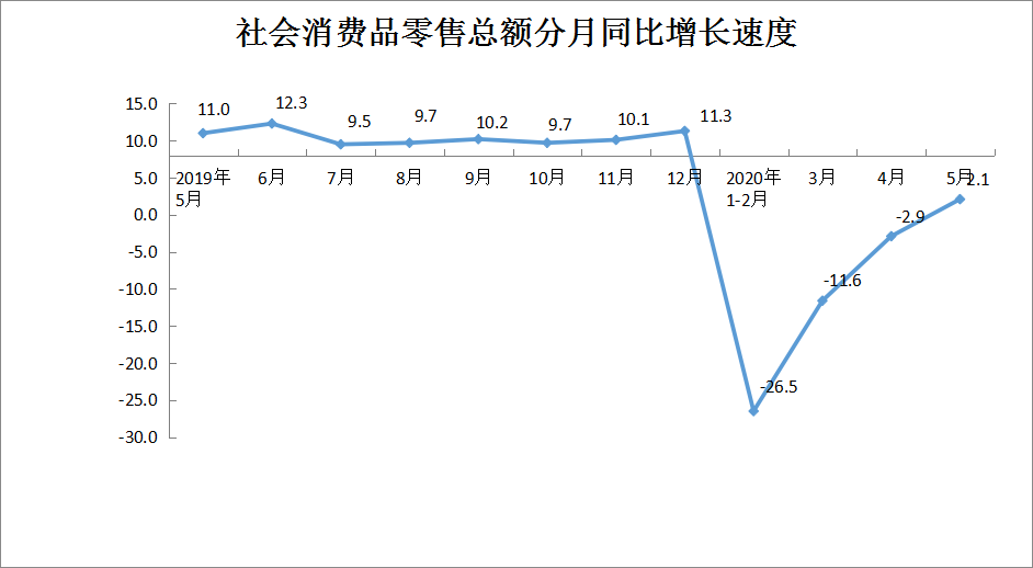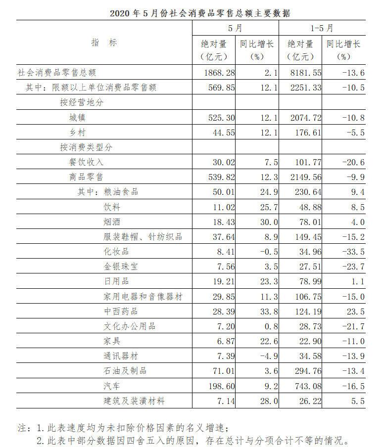 2020年1~5月份,社会消费品零售总额8181.55亿元,同比名义下降13.6%。其中,限额以上单位消费品零售额2251.33亿元,下降10.5%。