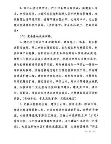 在《淮河方案》中记者看到,一大批重点交通工程、水利设施建设已将展开或正在加紧施工。其中,明确提出要建成郑万、郑阜、商合杭高铁河南段,开工建设京雄商高铁、京九高铁阜阳至黄冈段,积极争取宁西高铁、南阳经驻马店至阜阳铁路纳入国家相关规划。加快三门峡至江苏洋口港铁路建设,规划研究信阳至随州高铁、濮阳经开封至潢川铁路等项目,规划建设洛阳——平顶山——漯河——周口城际铁路。实施连霍高速商丘至豫皖省界段及宁洛、日南等高速改扩建工程,建设京港澳高速东、西复线河南段,支持信阳明港机场改扩建,推动商丘市、平顶山市、周口市等建设支线机场。加快淮河干支线航运开发和港口建设,建成周口市、漯河市、固始县、淮滨县内河港口口岸查验区,支持建设淮滨临港经济区。