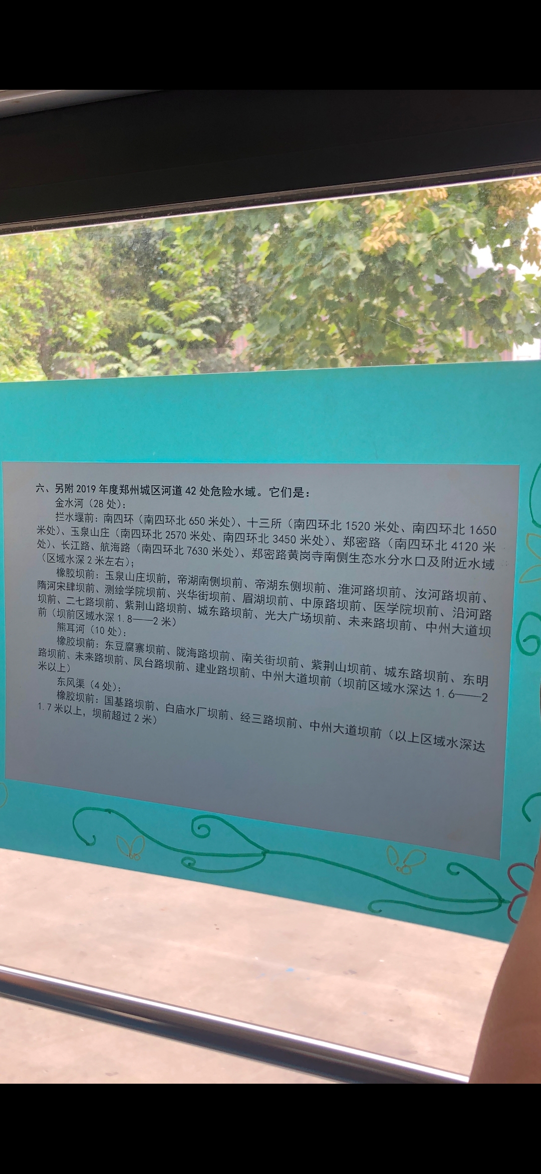 除了制作主题车厢,黄菲还从网上搜集了更新版的郑州42处危险区域分布,张贴在车厢内,黄菲介绍说,她所驾驶的线路经过东区很多水景观公园,每到傍晚的时候,就会有很多家长带着孩子去游玩,自己的孩子也八岁了,正是让人操心的年级,所以,就想通过这个车厢给大家做个提醒。