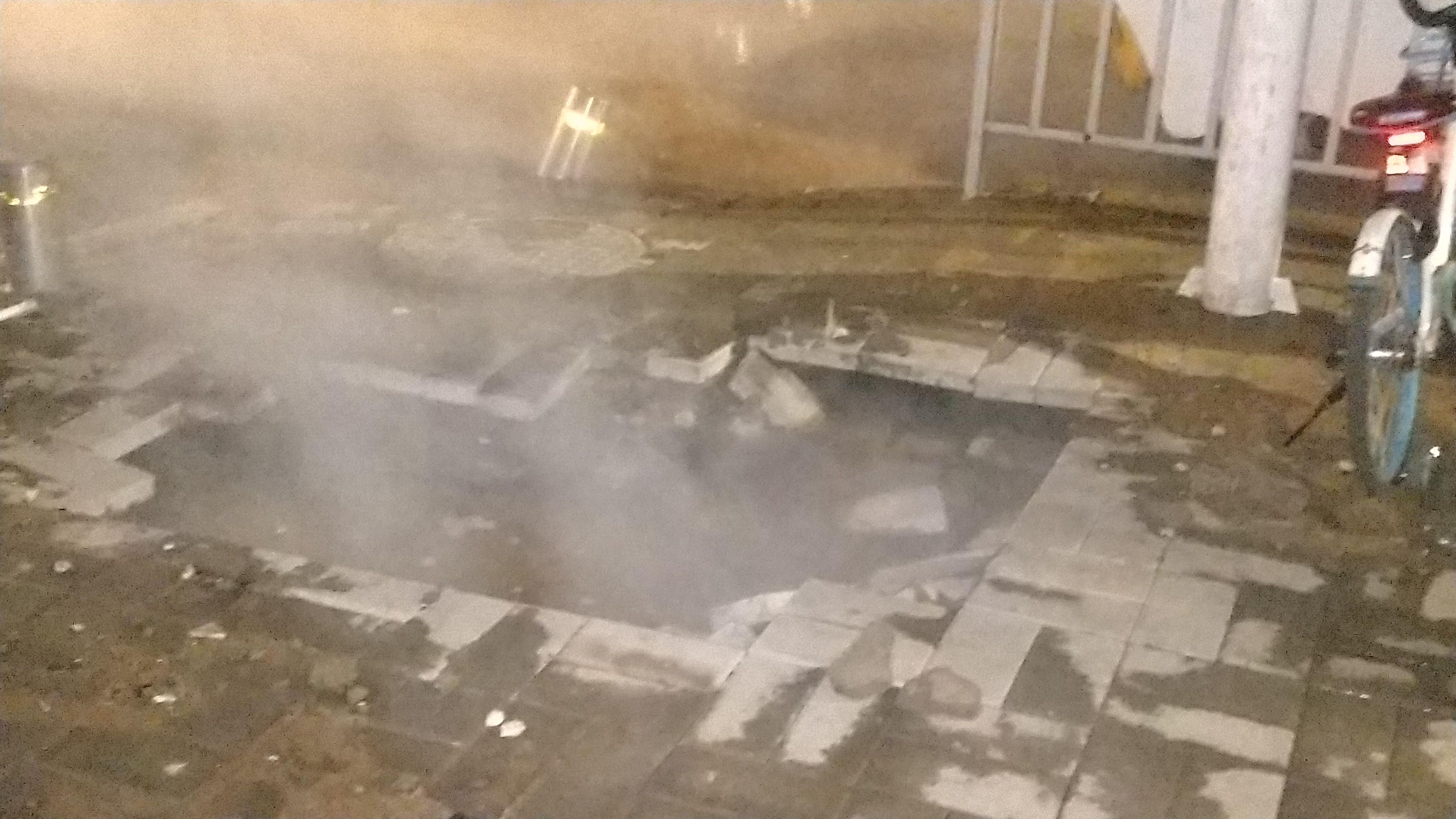 1月8日夜晚,郑州纬三路与经七路交叉口西约150米处,路南一家浴池旁边人行道下的热力管道突然爆裂,顷刻间,滚烫的热水喷涌而出,水柱高达15米左右,直接冲向旁边的居民楼。