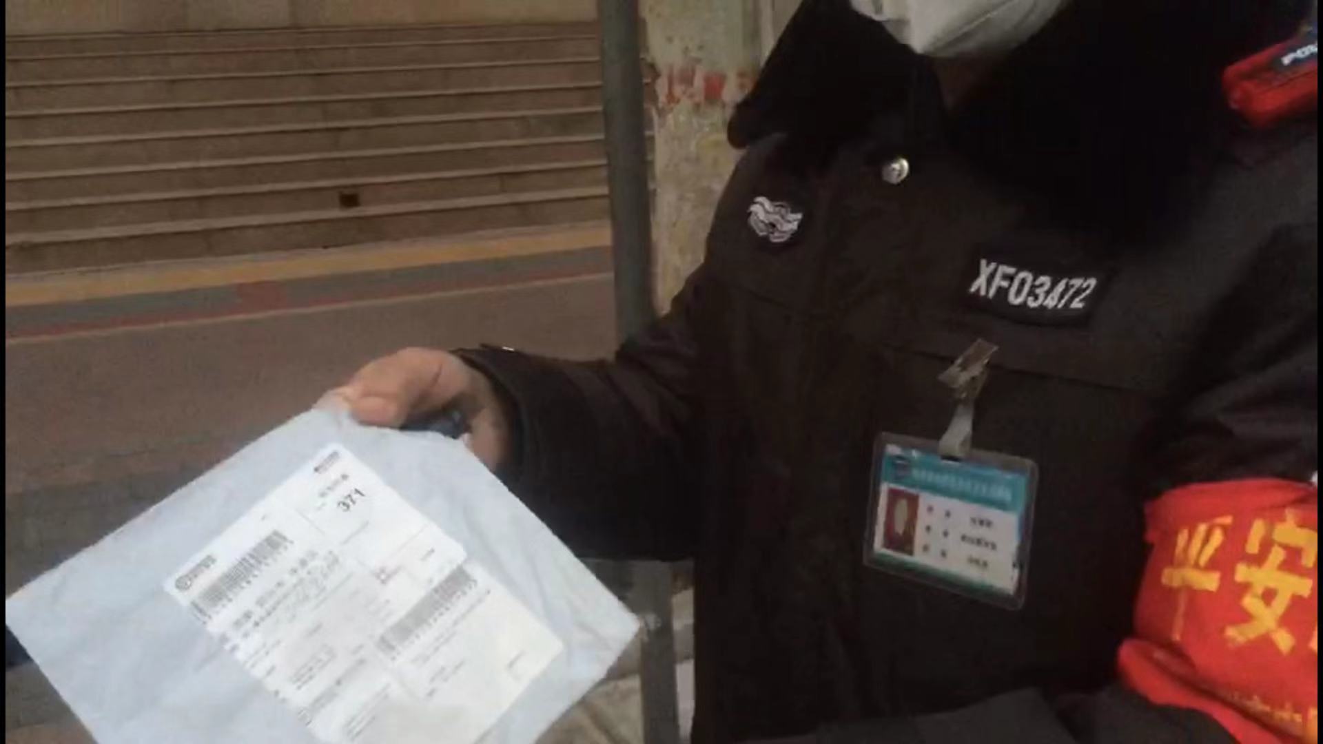 28日下午5点30分许,郑州市中原区林山寨街道碧沙岗社区巡防队员张长江、杜建民巡逻到互助路嵩山路口西约100米路北银行门前时,看见马路边掉着一个塑料快递包裹,巡防队员捡起来一看,发现是一个顺丰快递包裹,从包裹单上获知收件人是胡女士,是从江苏一药店网购的防护口罩,估计是快递员送件时不小心弄掉的。