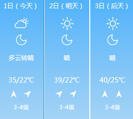周初(3-4日),全省将出现35℃以上的高温天气,部分地区可达38-40℃,北中部局部可达41℃。周三到周四(5-6日),全省多云到阴天,大部分地区有短时阵雨、雷阵雨天气。周内其它时间我省主要以晴间多云天气为主。