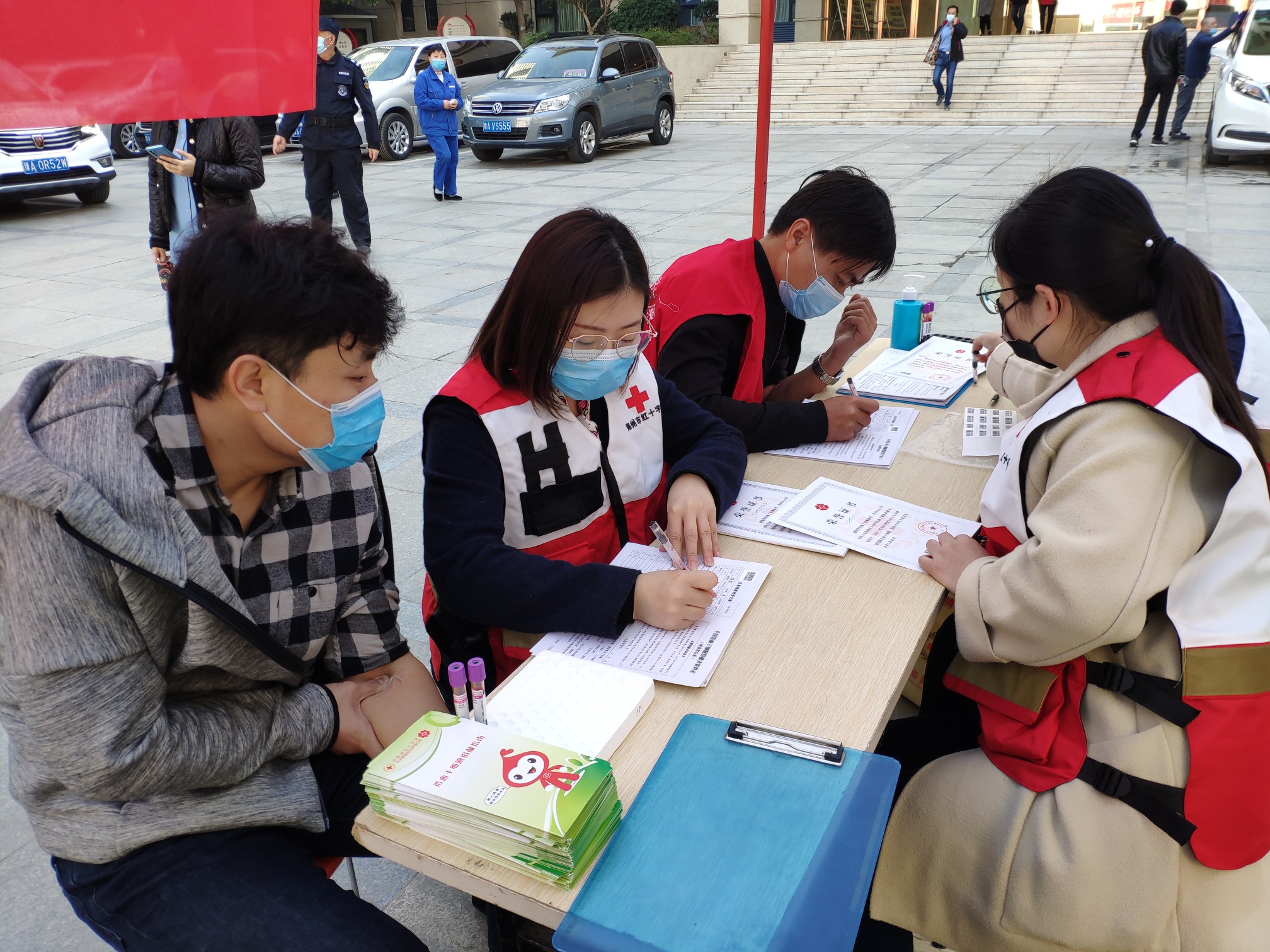 上午9时许,郑州市政协机关大院里,前来献血的爱心人士在志愿者引导下,坐在小马扎上耐心排队。大家保持1米安全距离,认真填写献血登记表、验血、初检、登记、采血,秩序井然。