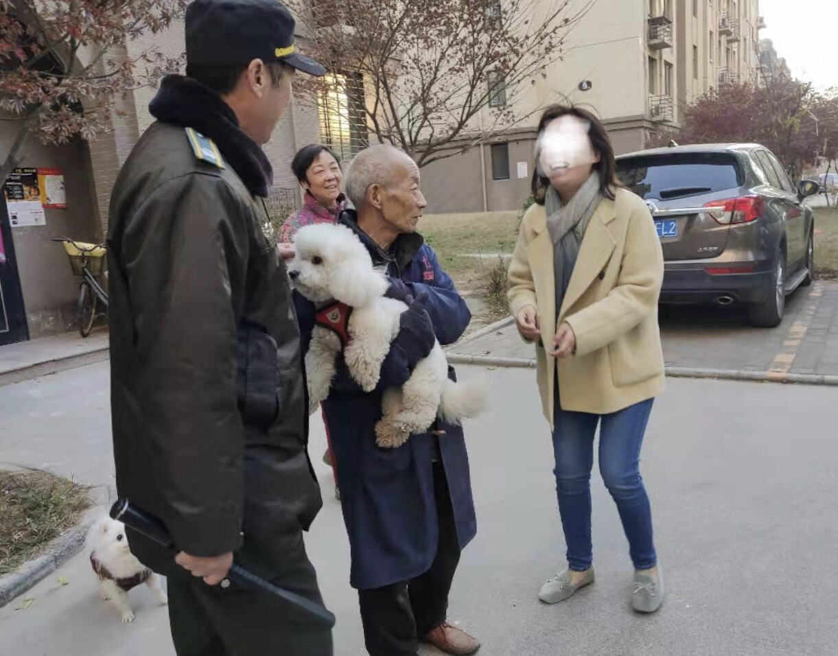 “起初,我以为这只狗是俺小区居民家的,可小狗一直跟着我走到家门口,后面也不见有主人跟着。从你们所说的特征来看,应该就是要寻找的狗,下午出来的时候,见这只狗还在小区里转悠”大妈说完,便领着巡防队员一起到小区里寻找。当走到小区10号楼下,,他们看到负责打扫小区卫生的张师傅,正抱着这只小白狗在寻找主人。