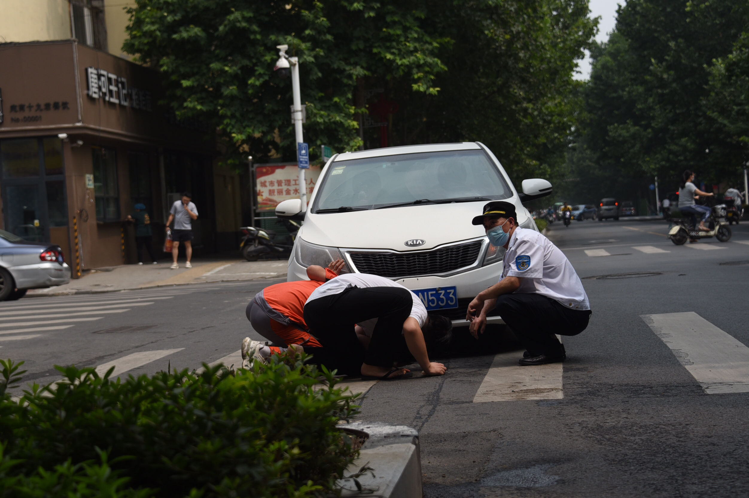 6月24日上午9时40分左右,郑州市金水区经八路办事处巡防队员孟庆斌、程子强、王麒祥等人,正在经八路与任砦北街交叉口执勤时,突然听到“呼嗵”一声巨响,只见一辆由西向东右拐的白色轿车,直接冲上了道路右侧的隔离绿化带,车底被绿化带边沿的石阶死死卡住,动弹不得。