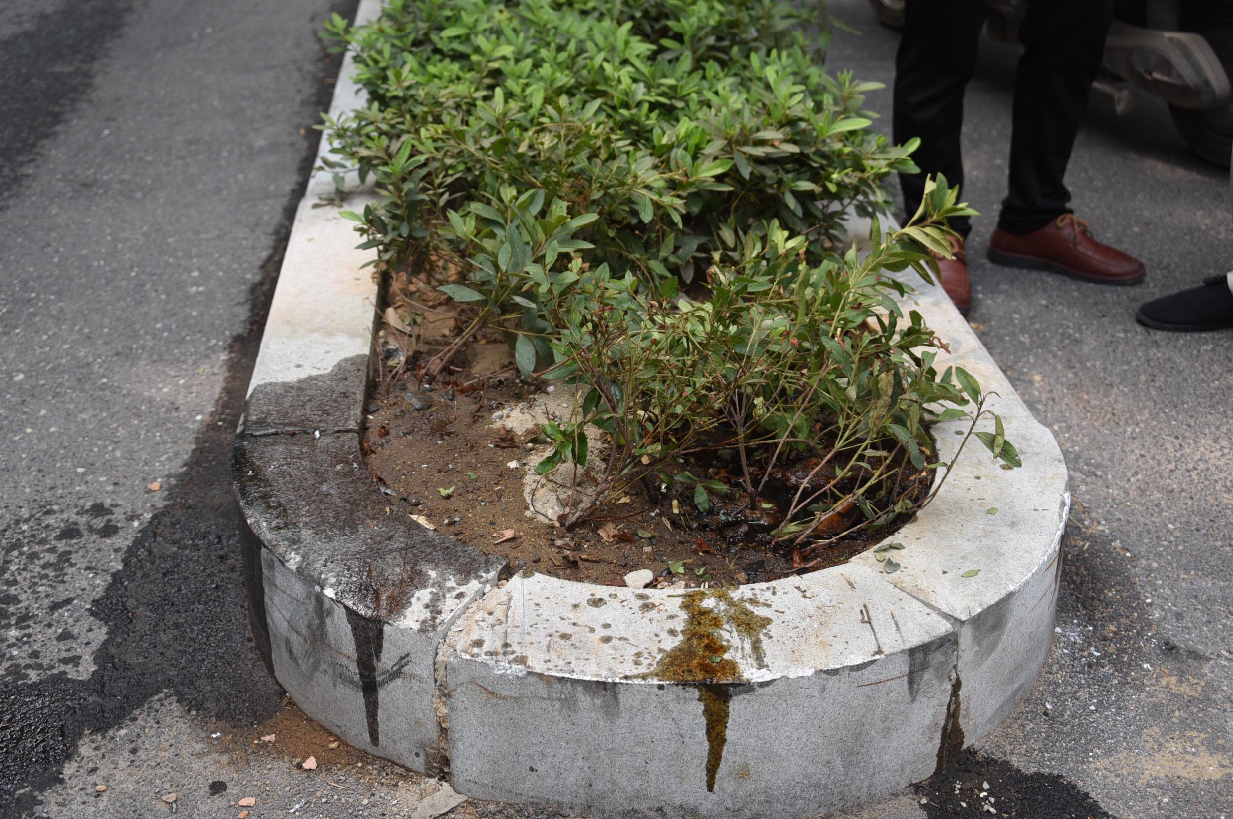 今天上午,在郑州街头,一辆挂平顶山牌照的轿车拐弯时,冲上了路中间的隔离绿化带,导致轿车底盘受损,绿化带植物被毁一片,隔离石阶被污损。肇事司机说,事故起因是他的轿车前挡风玻璃夜间被人“镀”了一层浅灰色涂料,严重影响了他的视线。