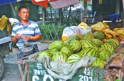 同样,在金业路上,来自洛宁66岁的瓜农麦铁仓带着自己14岁的孙子来城里卖瓜。“西瓜都是刚从地里摘的,可本地瓜就是卖不上价。”麦铁仓说,由于受外地瓜影响,本地瓜一上市价格就不高。