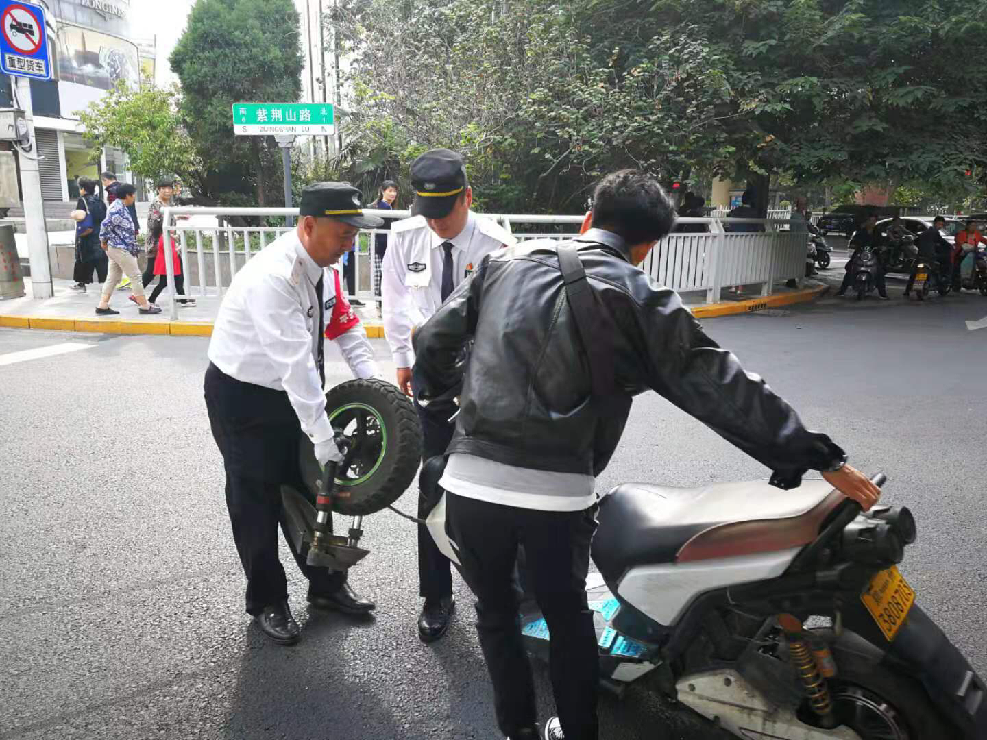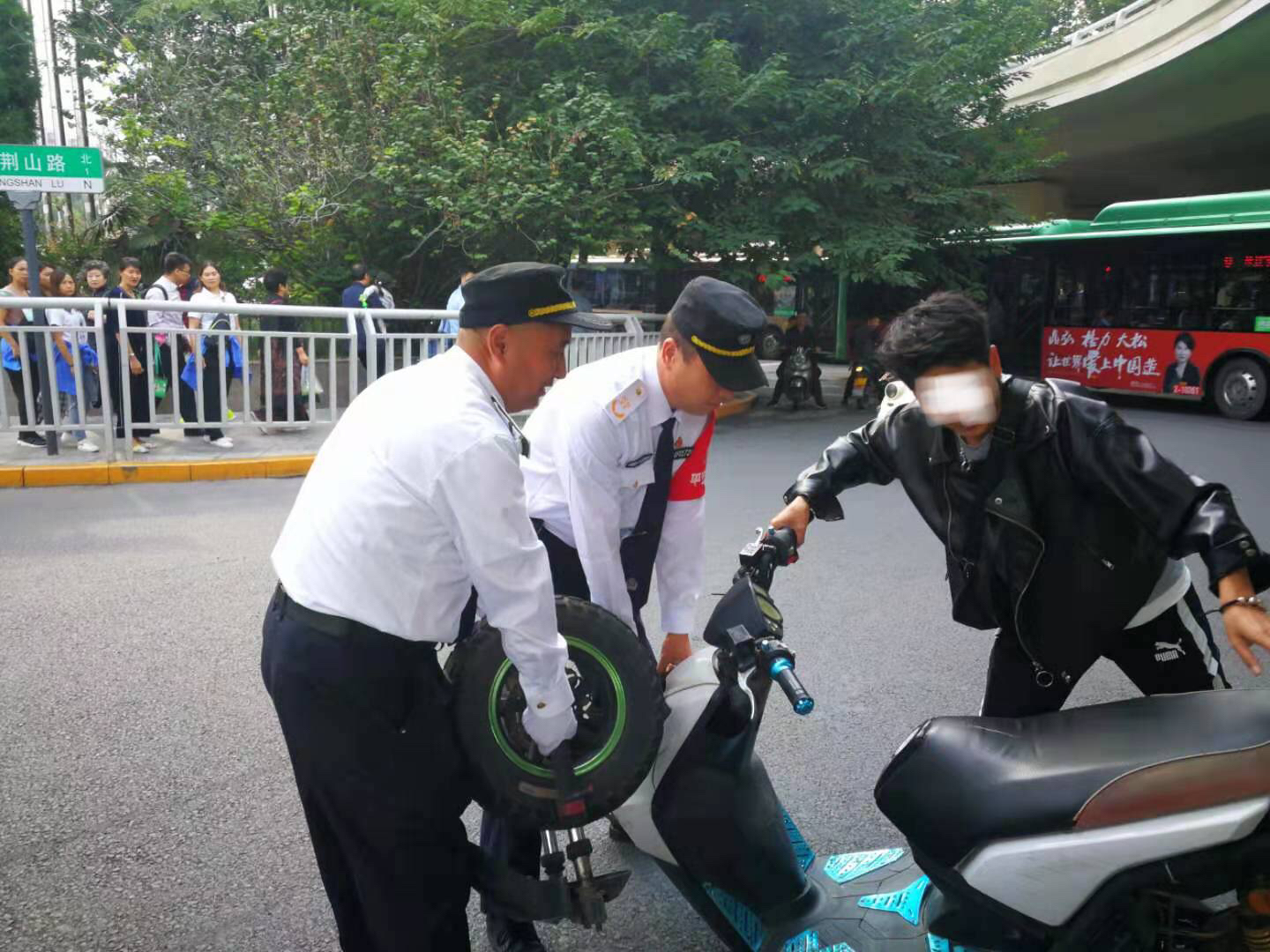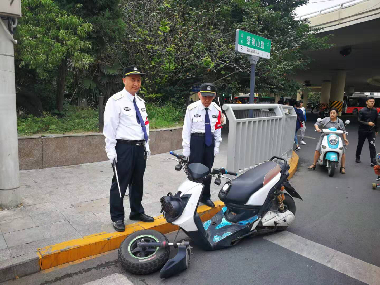 看到自己的电动车“躺”在马路中间影响了交通,小伙忙上前把车扶起来,试图将车子挪到路边。然而,由于电动车的前轮脱落,电动车又比较沉重,小伙子搬了几次都未能成功。巡防队员张卫国等人见状,赶紧跑过去帮忙,将电动车连同脱落的前轮一起抬到了路边。
