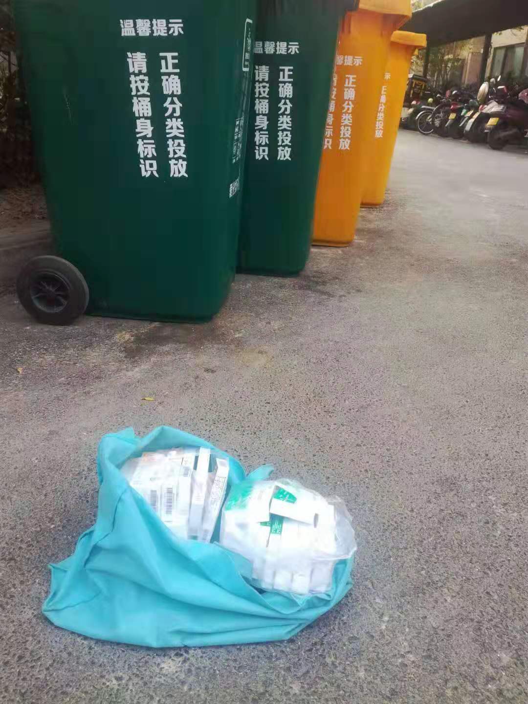保洁员说:“刚才给垃圾分类时,我发现垃圾桶里有一个白色的袋子,打开袋子看到,里面装有六个品种的药品共25盒。起初我以为这些药品过了有效期,是被居民扔掉的,可后来我仔细看了看,发现都是刚刚生产的……我不知道这些药品的来源,也不知道接下来该如何处理。”
