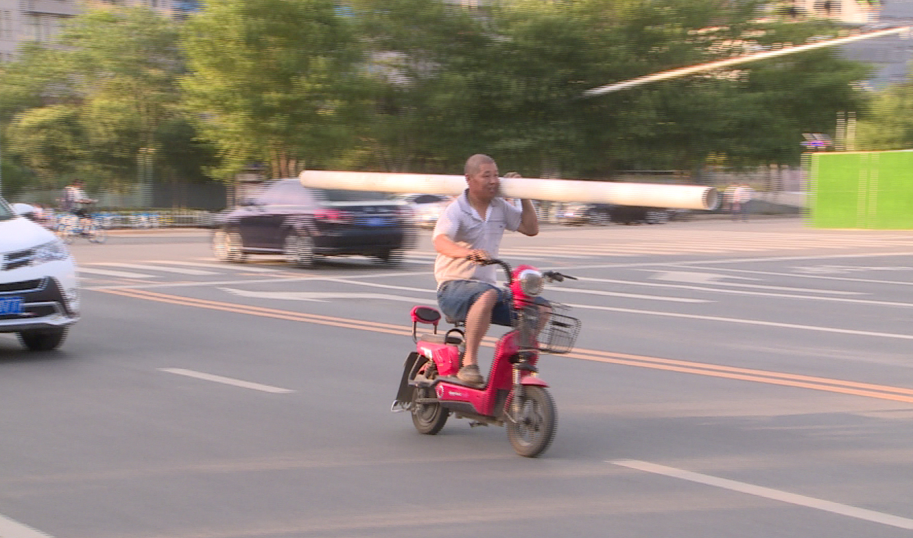 郑州一男子骑着电动车扛着6米长的“金箍棒” 吓坏路人