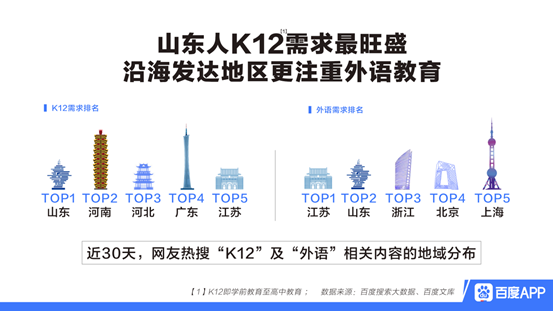 从搜索的具体内容分布看,K12与外语的用户需求量最高。兴趣爱好、学前教育、留学、高等教育、职业培训等教育培训行业的市场潜力同样巨大。同时,这一现象在地域分布上呈现出明显特征。山东、河南、河北等高考生源大省最关注K12。而沿海城市及首都由于对外交流更频繁,外语教育的需求也更加旺盛。