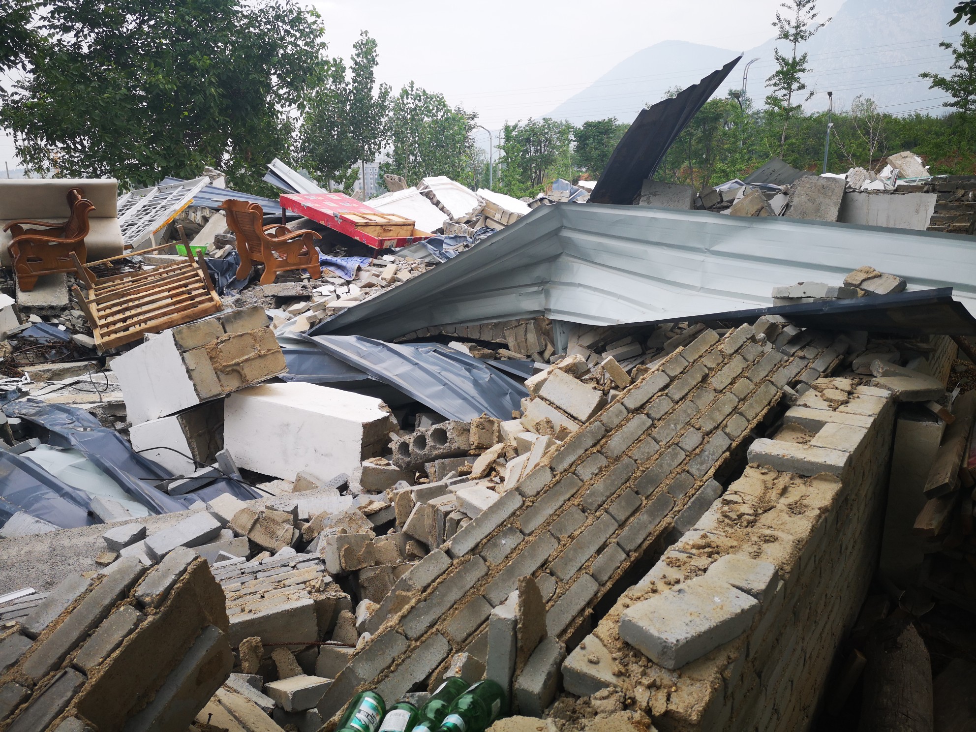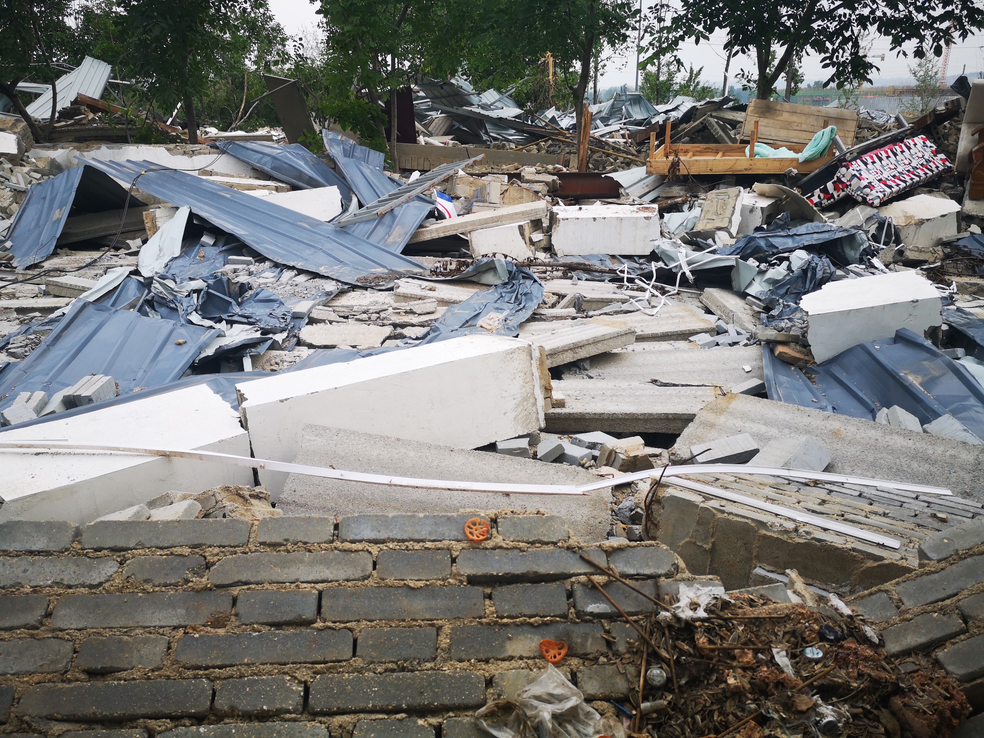 6月28日下午,大河报•大河客户端记者实地探访时发现,薛先生家南侧房屋被拆除,现场散落着床垫等物品,蓝色的铁皮房顶裸露在外,地上一片狼藉。