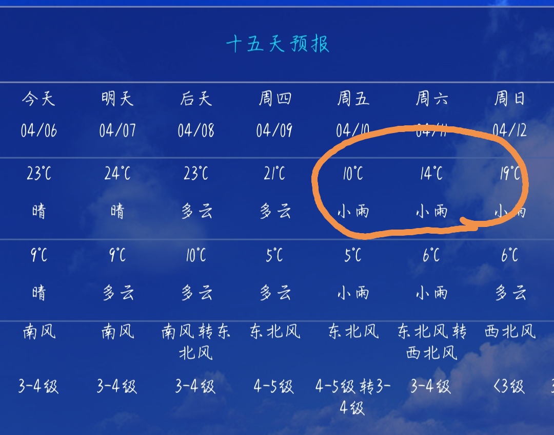 4月10日(星期五):阴天有小雨,偏北风4级-5级 6℃-10℃