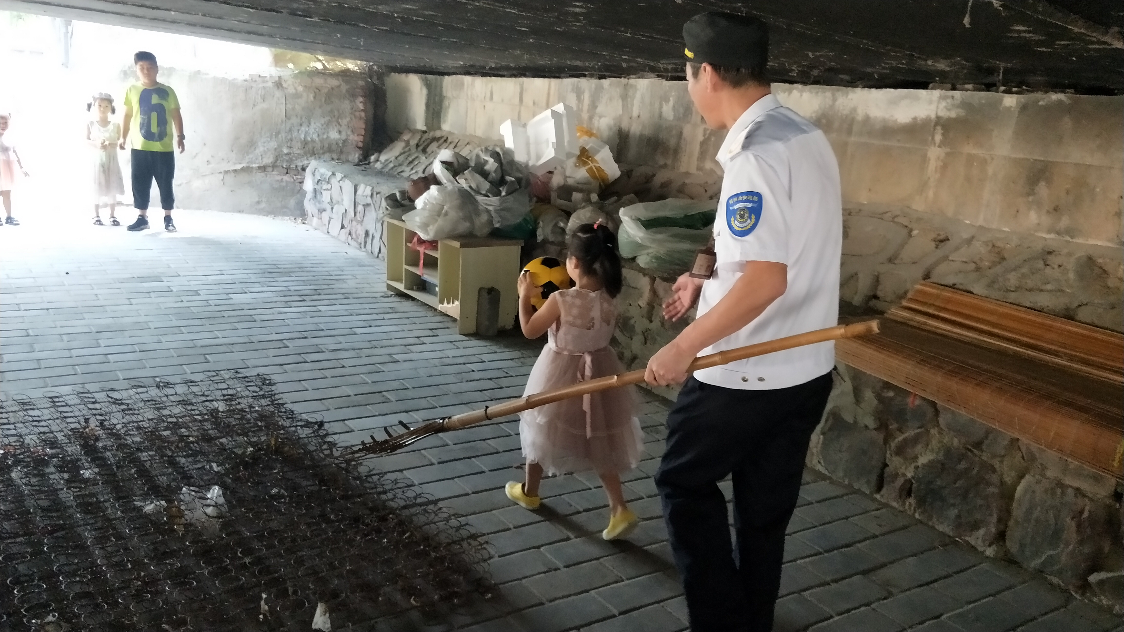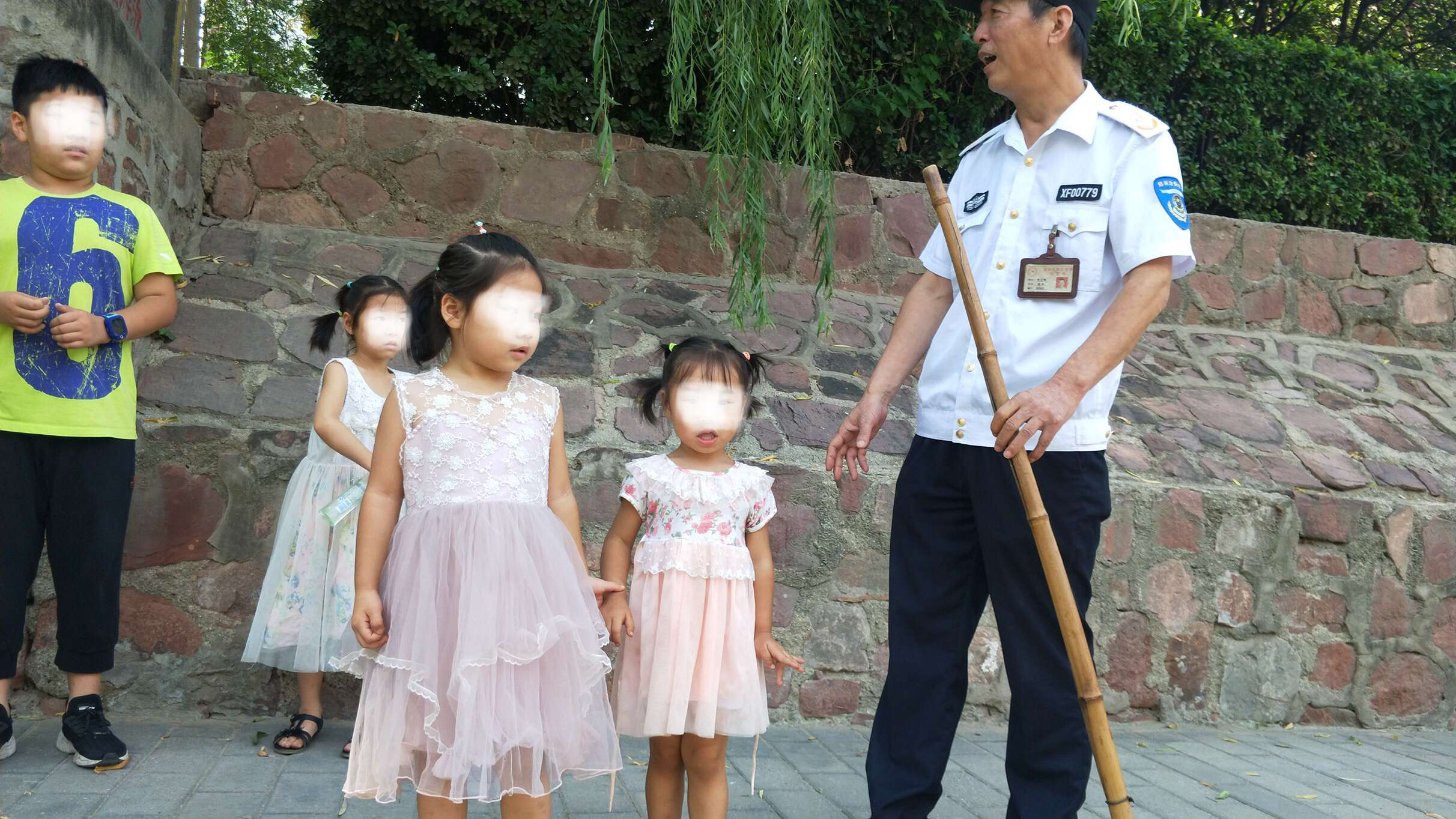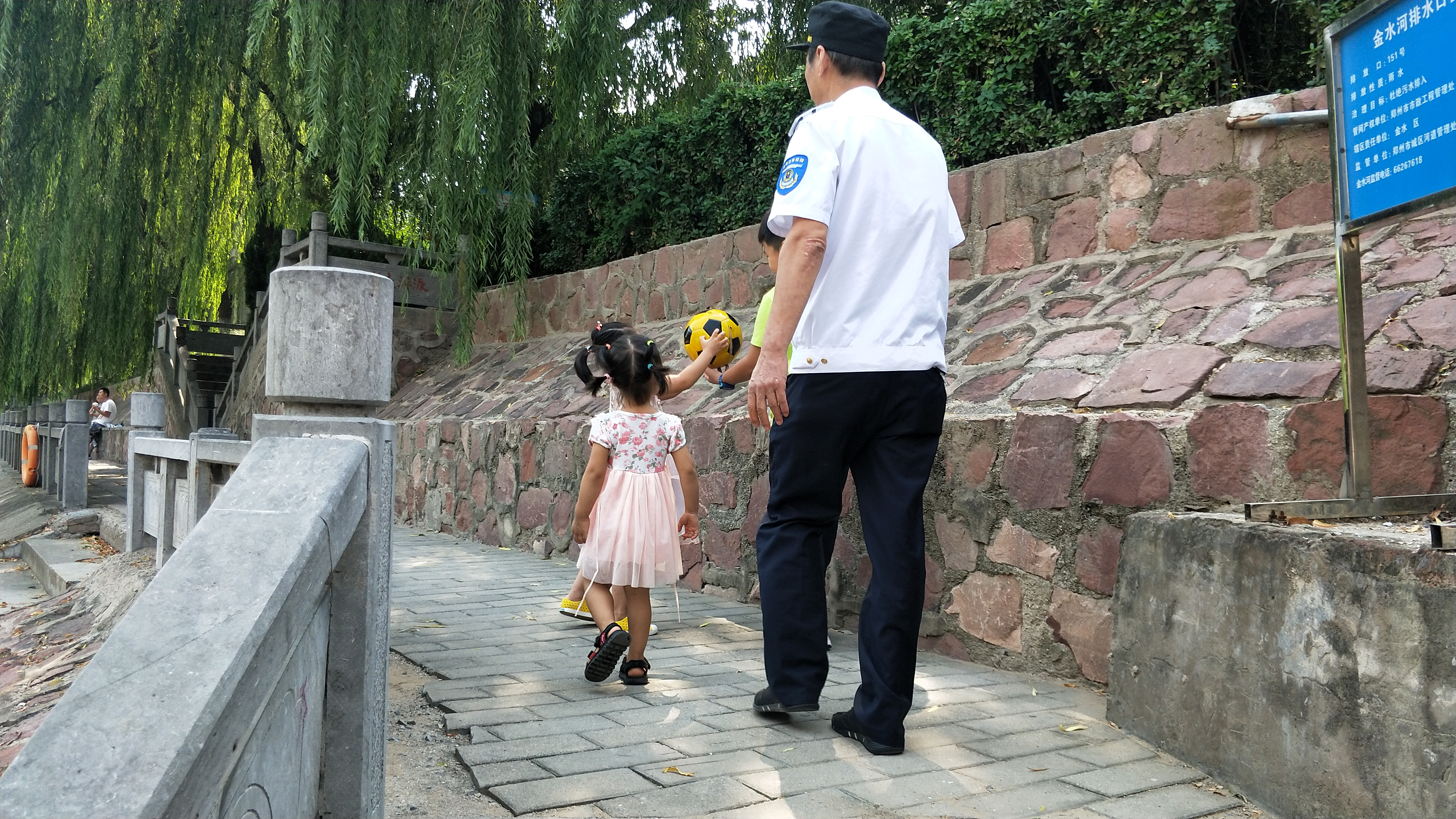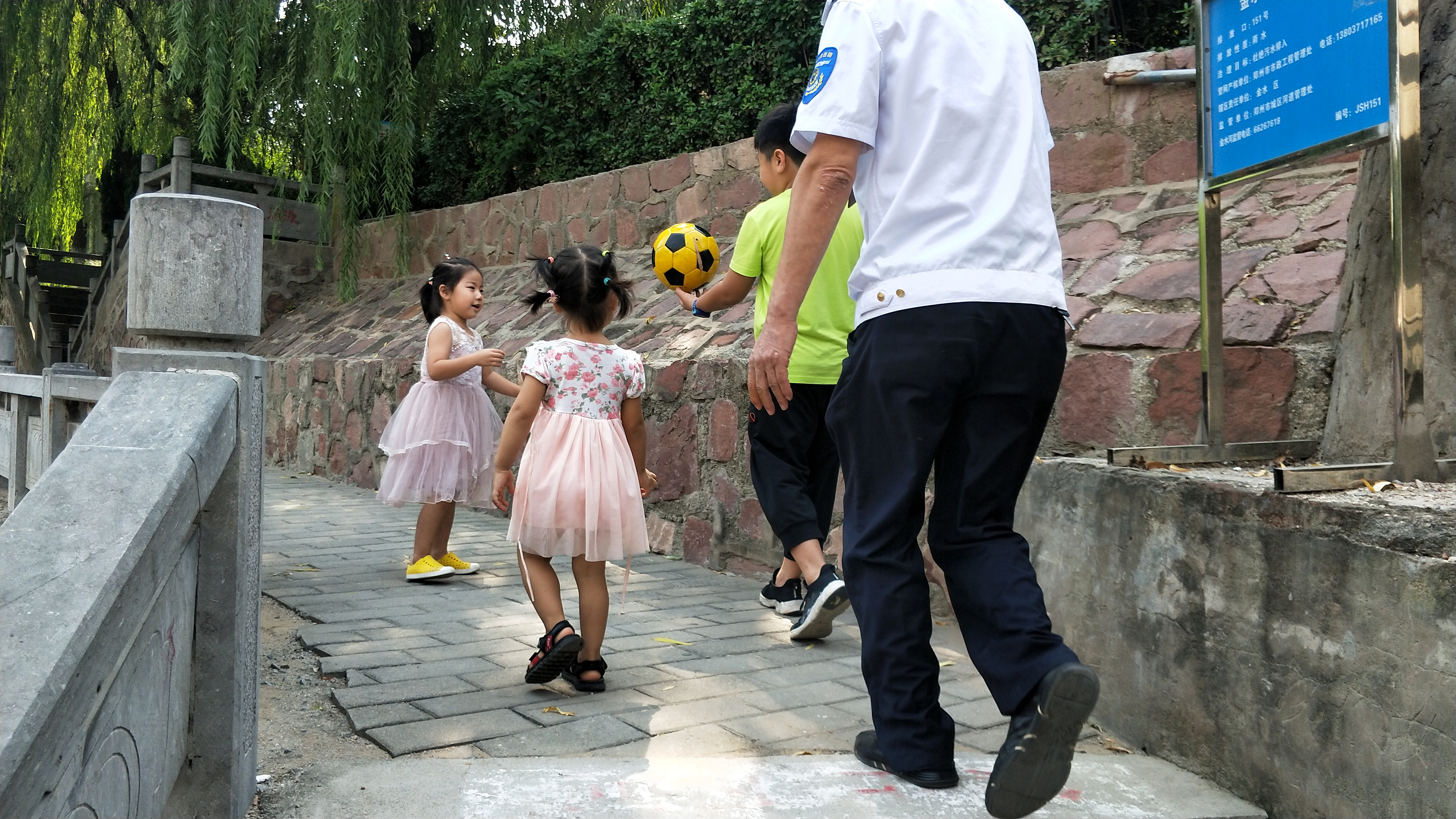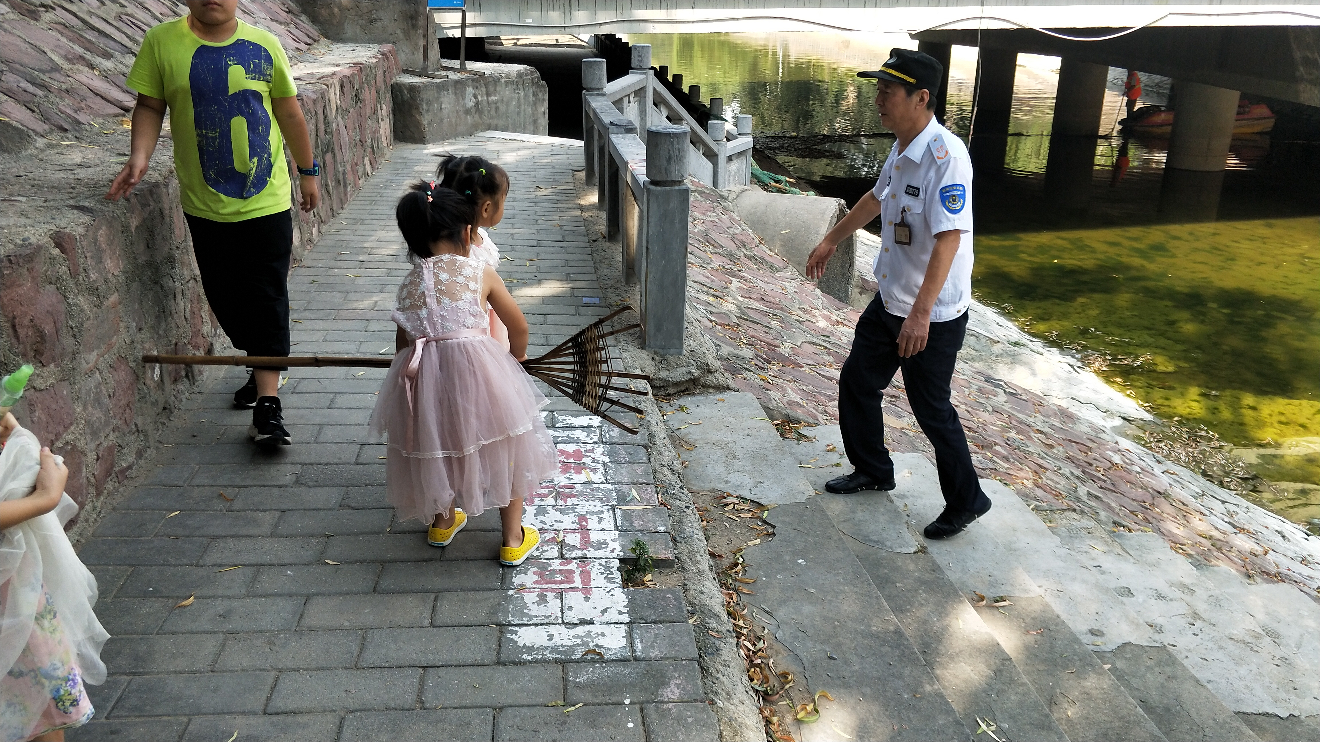今天上午11点20分左右,金水区经八路办事处巡防中队队员李忠权、孟庆斌等人,巡逻至金水路杜岭街桥头时,突然发现几个小女孩站在河边,其中一名小女孩手里拿着一把打捞水草的竹耙子要下河,想打捞漂在水面上的一个皮球。眼见情况危险,李忠权等人赶紧大声呼喊阻止。