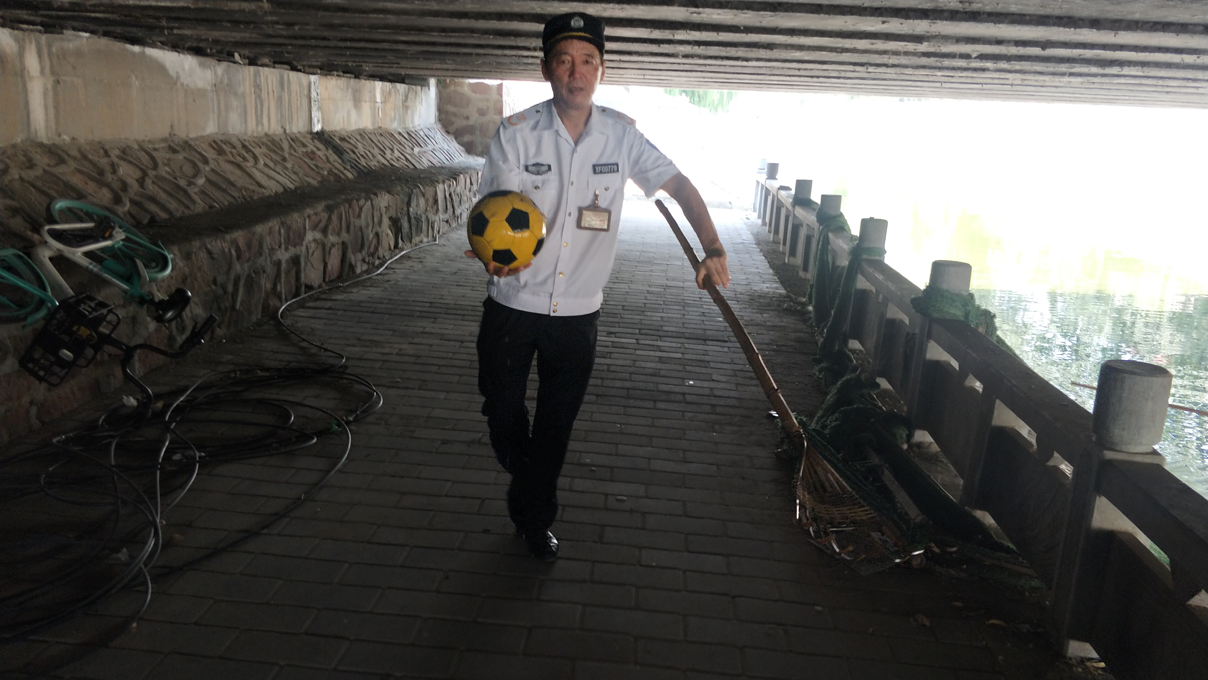 李忠权看到水面上漂浮的那个黄黑相间的皮球,顺着水流向东飘走,已距离岸边两米多远,忙从小孩子手中要走竹耙,帮他们打捞皮球。与此同时,队员孟庆斌则将小朋友们带到岸边安全地方,以免意外发生。