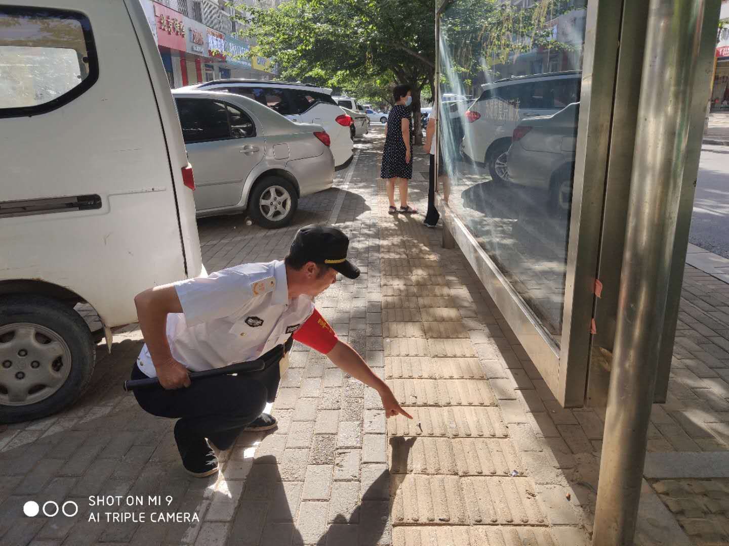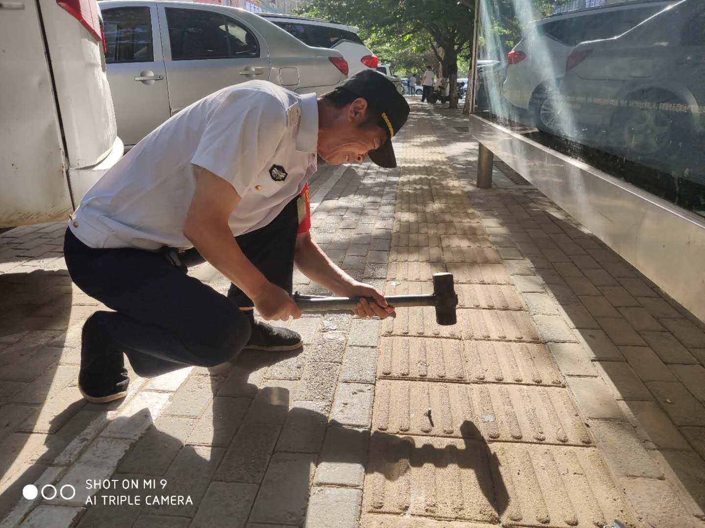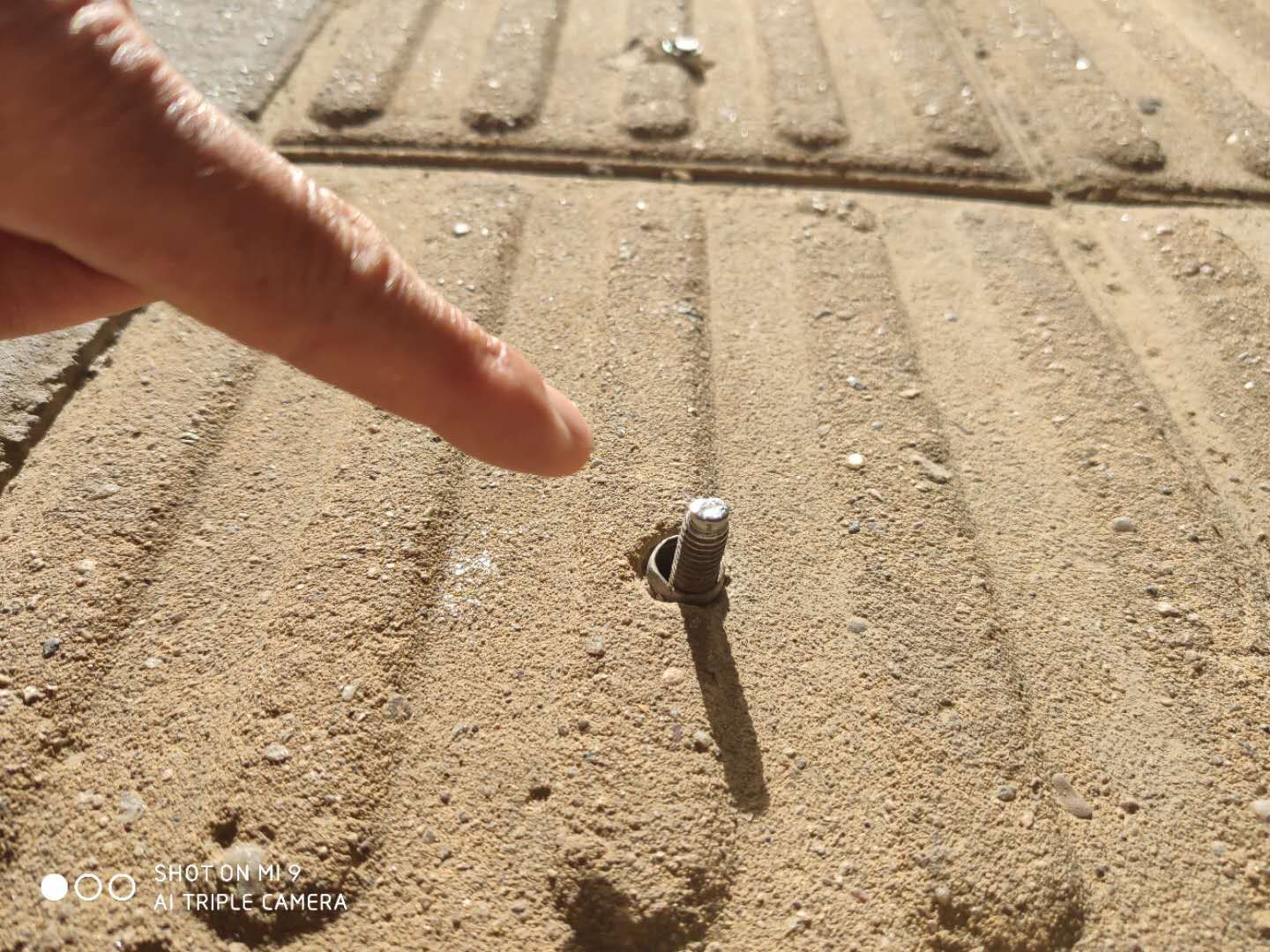 几个注意到,在公交站牌下面,正对盲道中间位置,一东一西出现两个高约3厘米的膨胀螺丝头,在朝阳下闪着光芒,由于隐伏在人行道上,如果路人稍不注意,确实很容易伤到路人。李高学用手试了试,想把冒出地面的膨胀螺丝摁回地下,可用了好大劲儿,膨胀螺丝却依然坚挺。无奈,只好留下队友现场提醒路人注意避让,自己跑到附近一家汽车修理店借来锤子,将膨胀螺丝砸进地下。