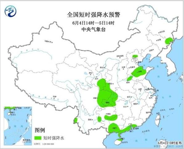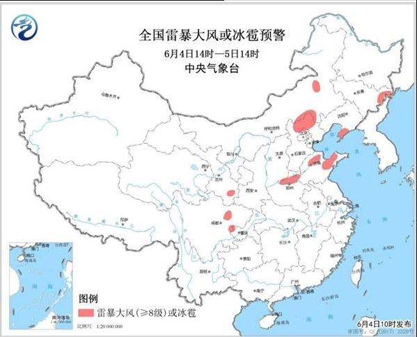 预计6月4日14时至5日14时,内蒙古东部、吉林东北部、辽宁南部、河北北部、山东北部、河南北部、甘肃南部、四川东北部等地的局地将有雷暴大风或冰雹天气;吉林东北部、北京北部、山东西北部、河南东北部、甘肃南部、陕西西南部、四川东北部、重庆、湖北西南部、贵州北部和东南部、云南西部、广西中南部、广东南部和东部沿海等地的部分地区将有短时强降水,小时雨量20-40毫米,局地可达50毫米以上。